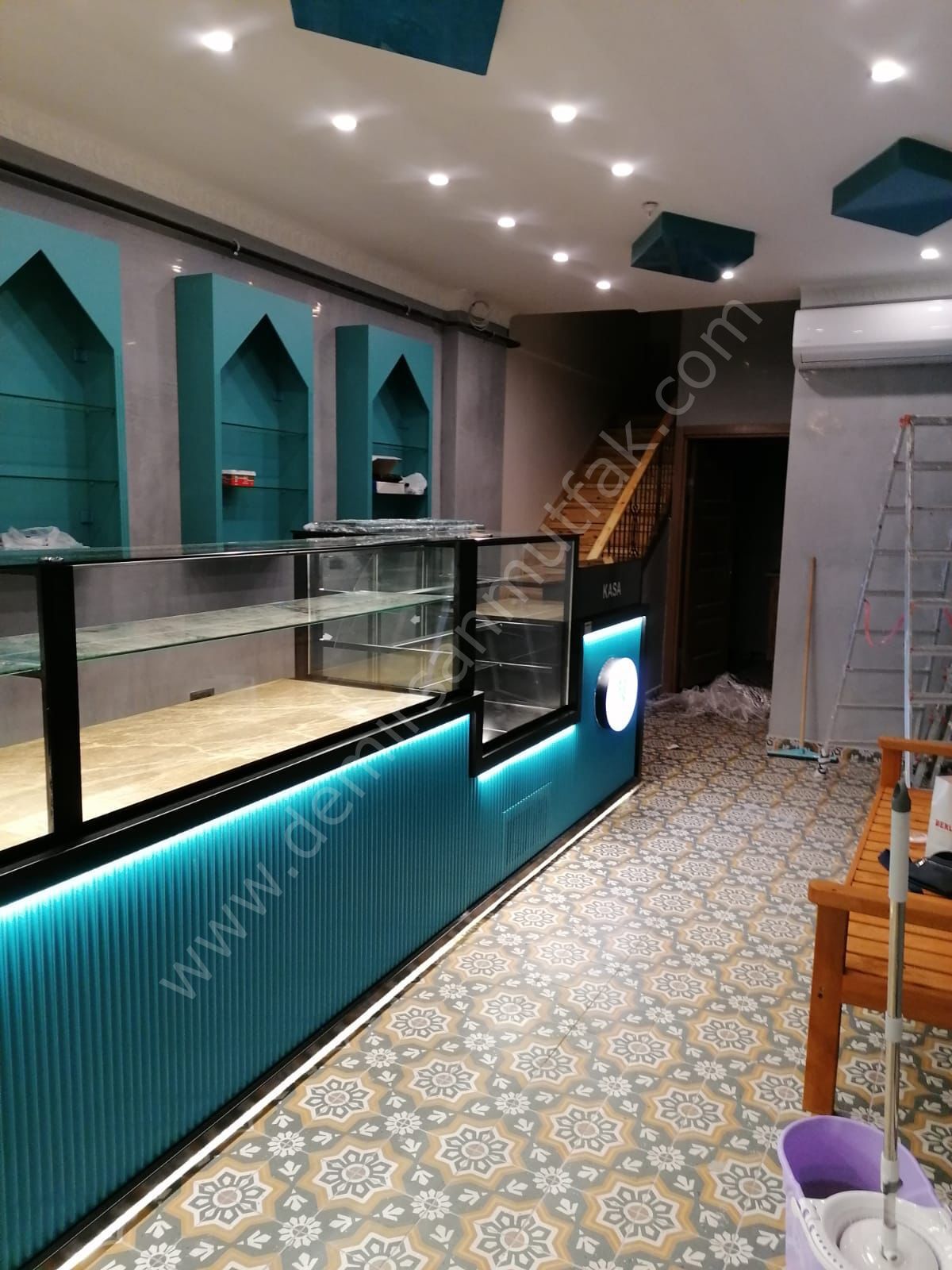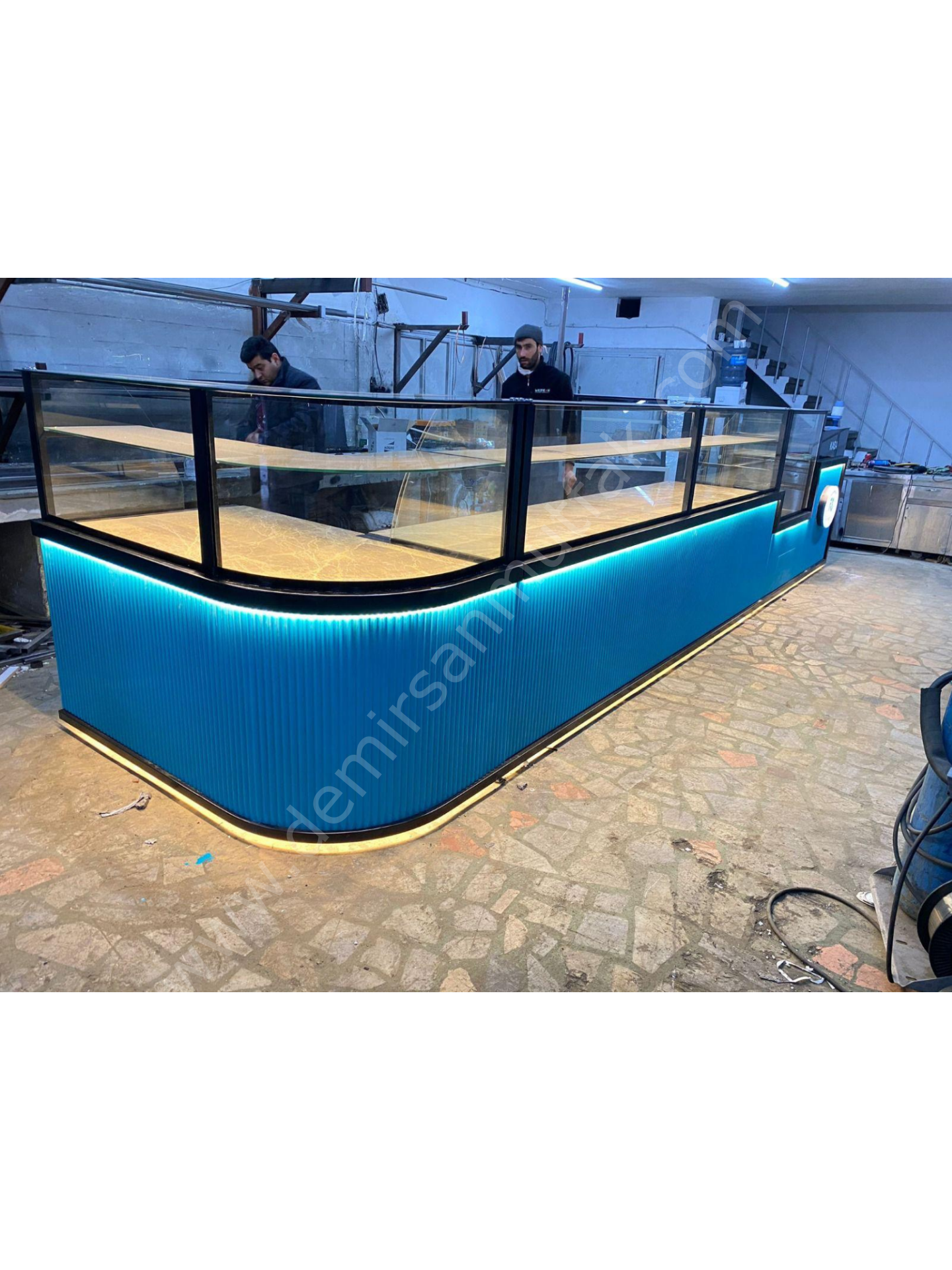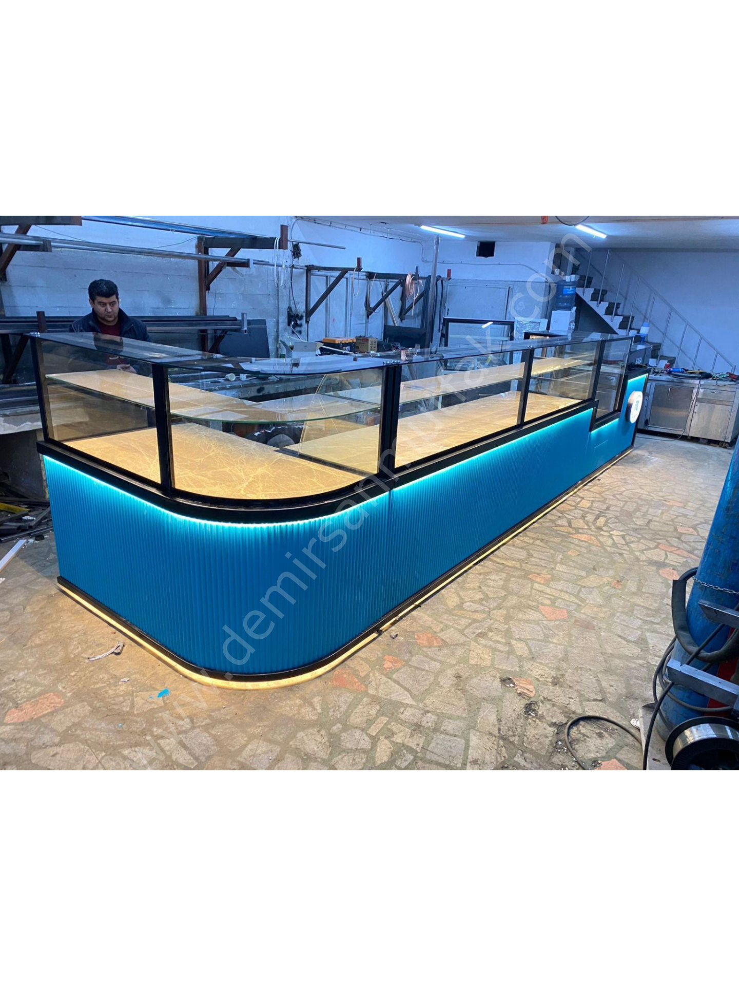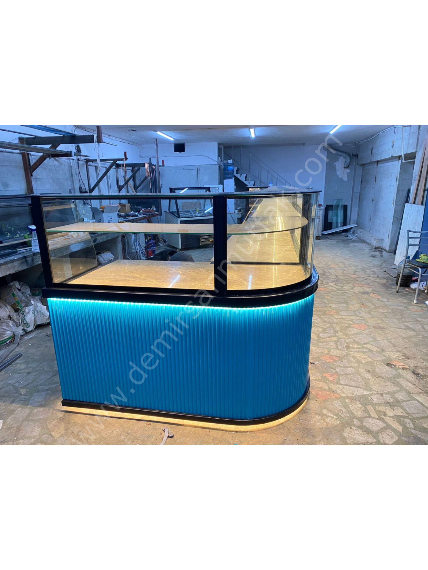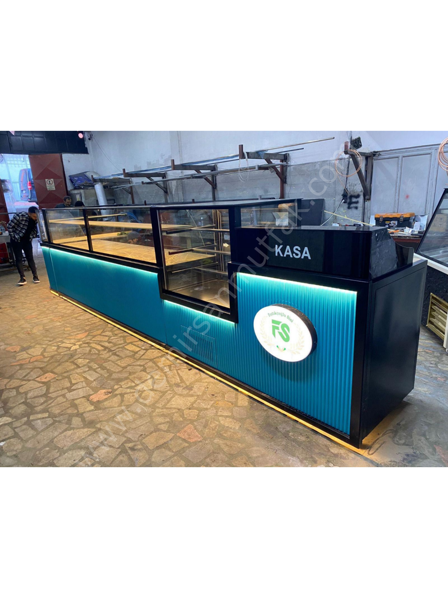 Modern dekor anlayışıyla tasarlanan ön panel detayları ve turkuaz tonlu LED aydınlatma, mekâna premium ve davetkar bir atmosfer kazandırır. Entegre kasa bölümü ise satış sürecini tek noktadan yönetebilmenizi sağlayarak operasyonel verimliliği artırır. Bu yapı, müşteri akışını düzenlerken çalışanların hareket alanını optimize eder ve yoğun saatlerde bile kontrollü bir servis deneyimi sunar.
