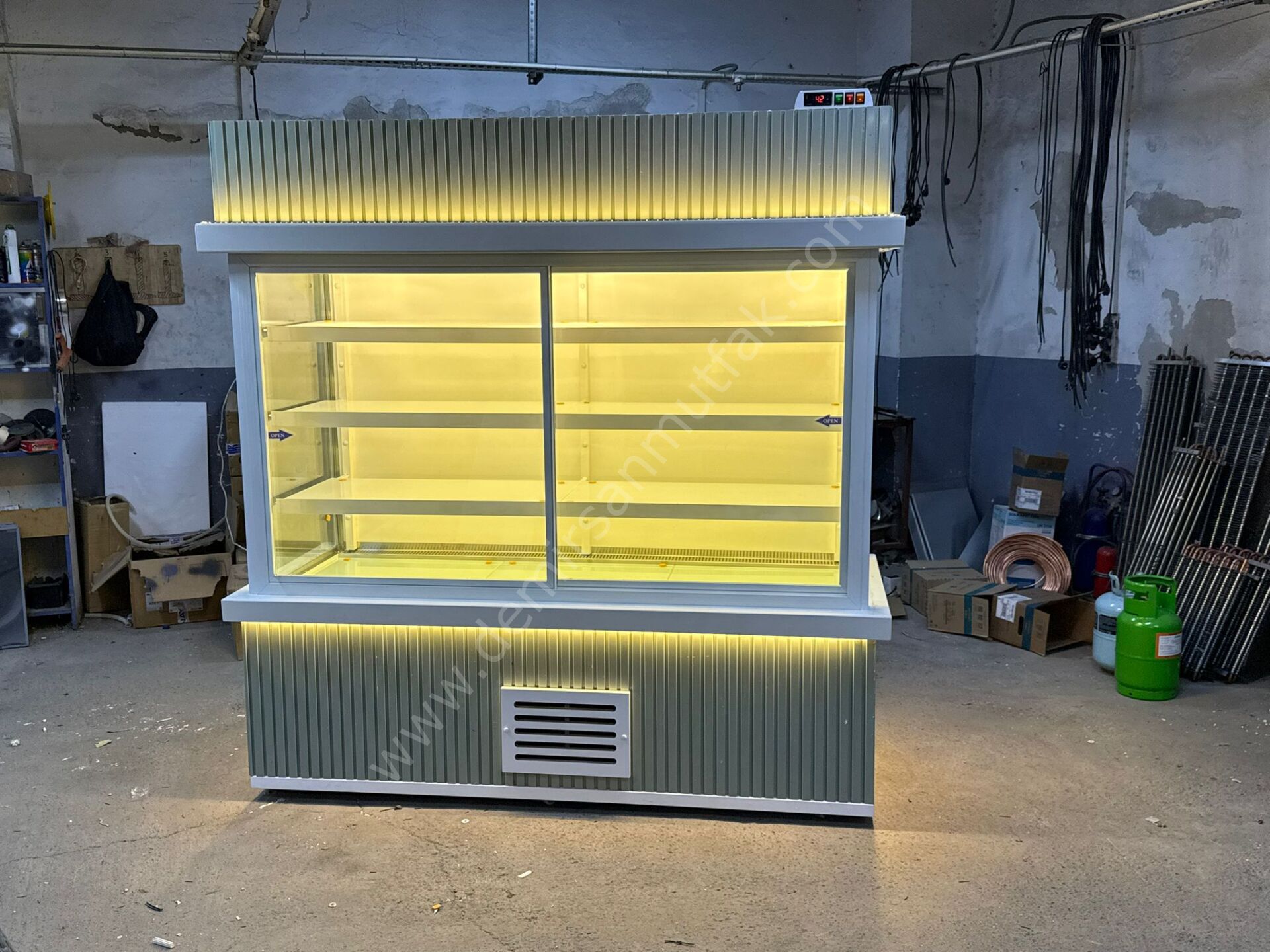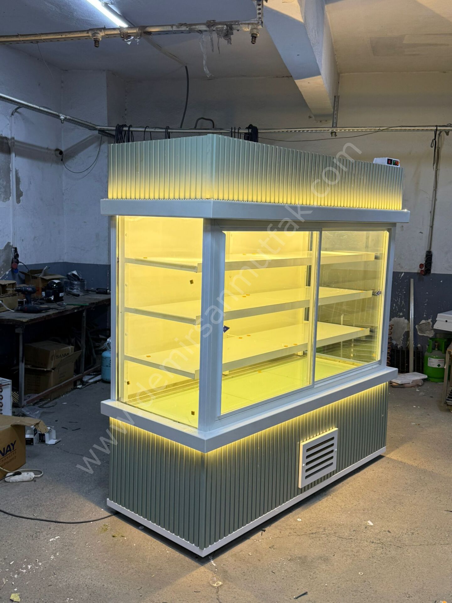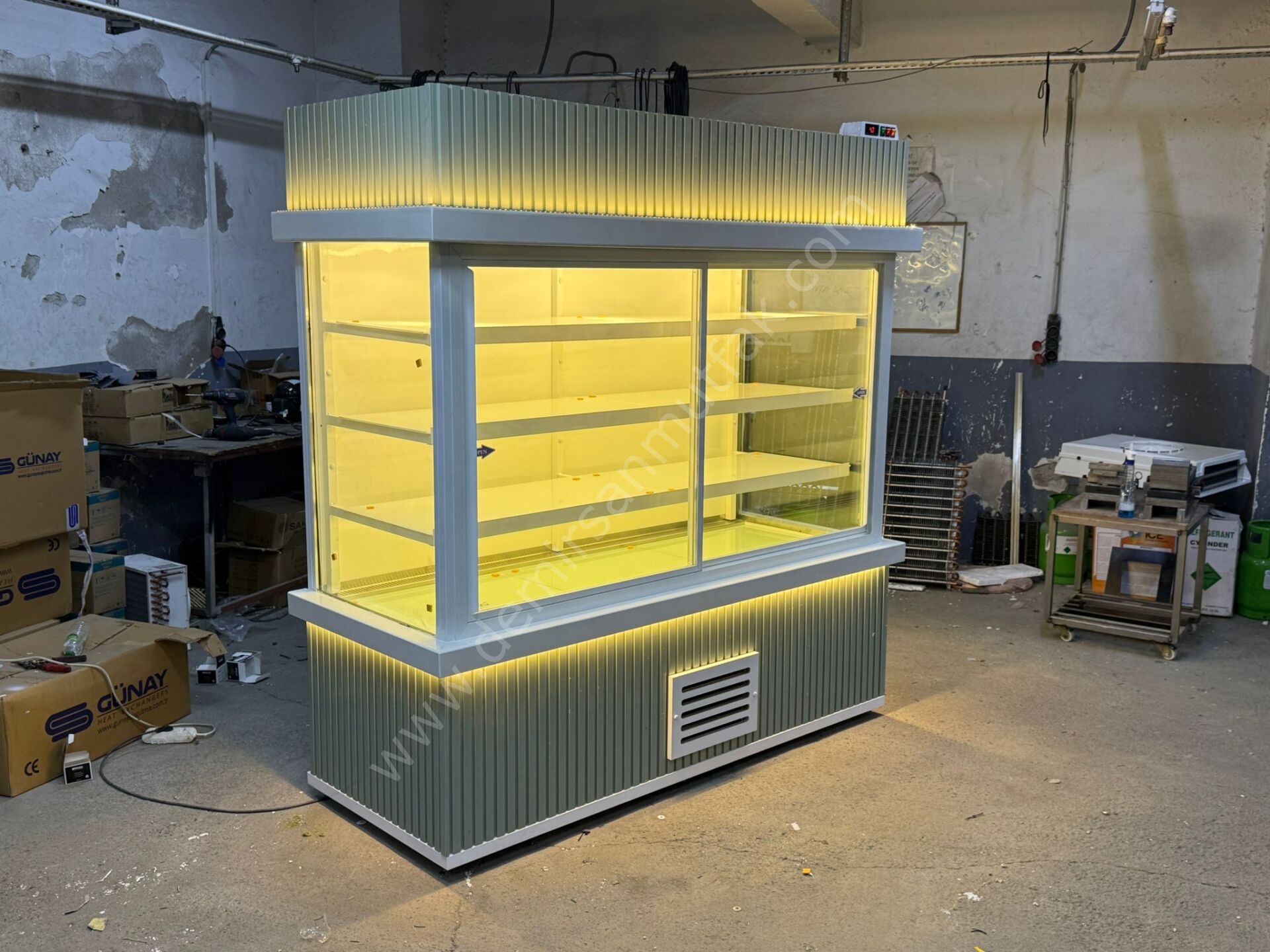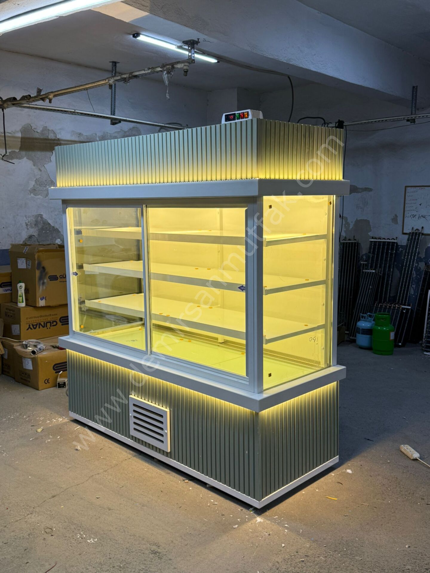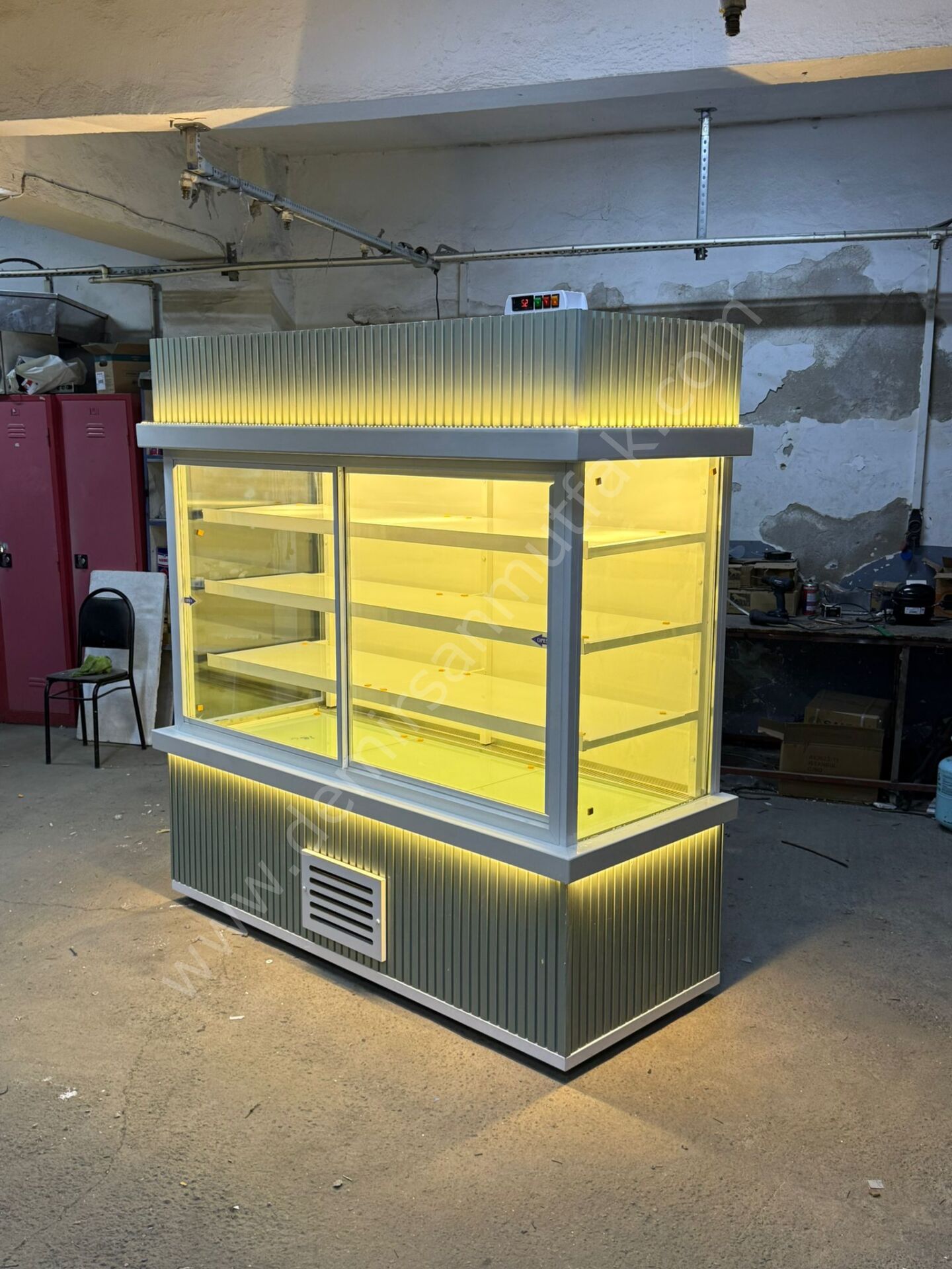 Modern LED aydınlatma sistemi ürünlerin renklerini daha canlı gösterir ve tazelik algısını yükseltir. Üst bölümde yer alan dekoratif aydınlatma detayı ise vitrine premium bir ambiyans kazandırarak markanızın kurumsal duruşunu destekler. Minimal çizgilere sahip gövde yapısı, hem modern hem de klasik mağaza dekorasyonlarıyla kolayca uyum sağlar.