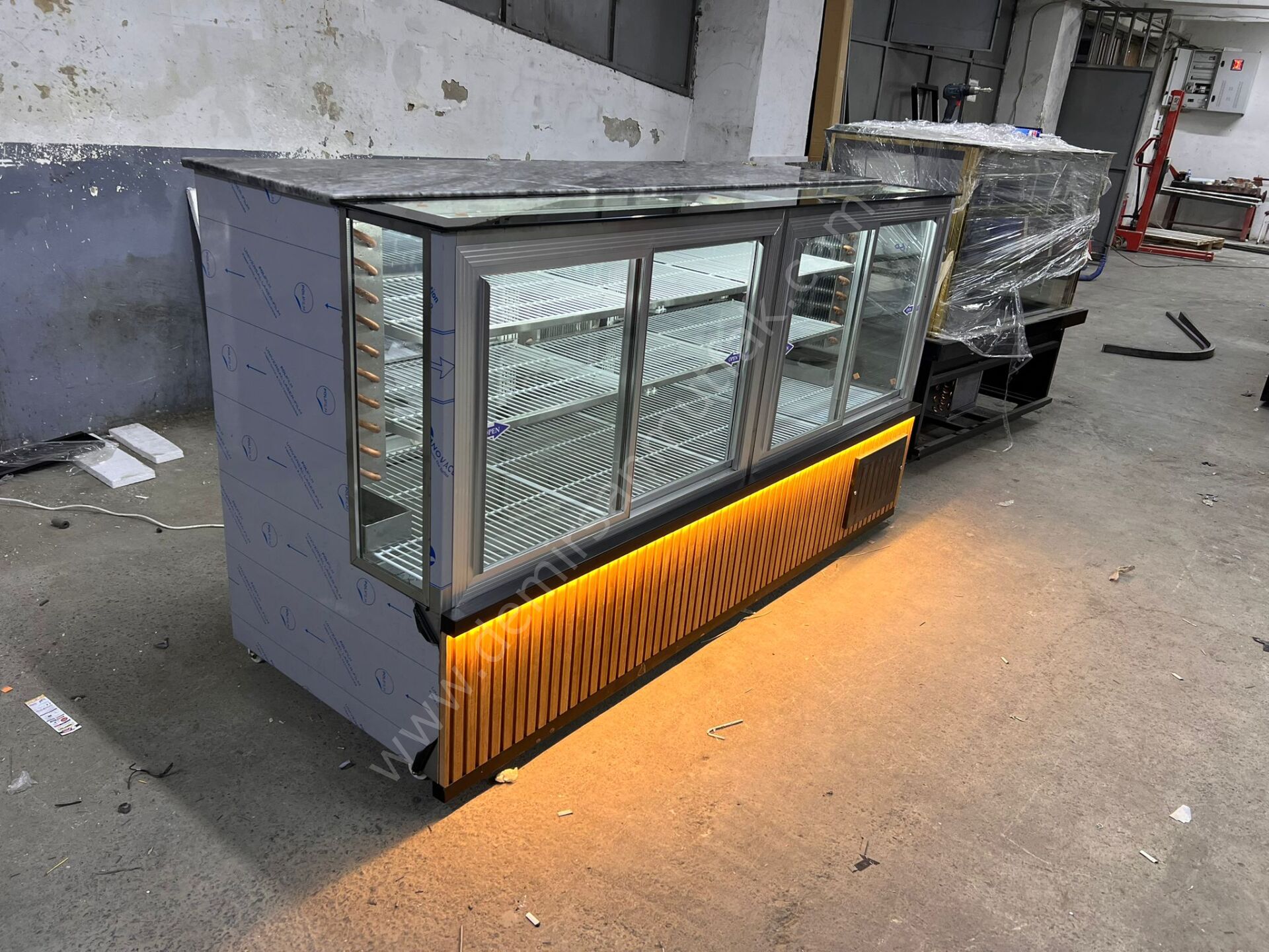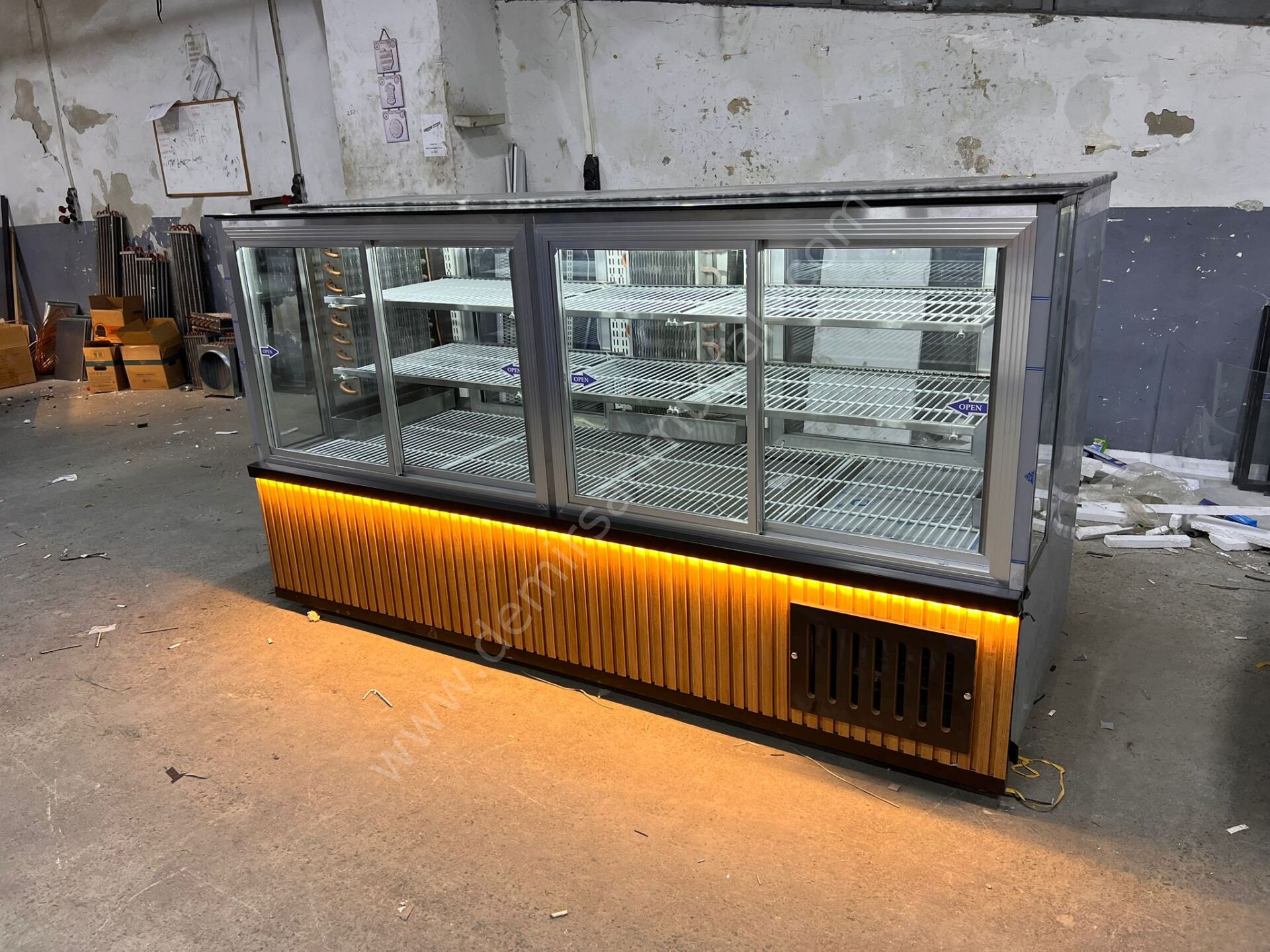 Dolabın ön bölümünde kullanılan ahşap görünümlü dekor panel ve sıcak tonlu LED aydınlatma, işletmenize modern ve davetkar bir atmosfer kazandırır. Doğal dokularla desteklenen bu tasarım, müşteride kalite ve güven hissi oluştururken mekânın genel dekorasyonuyla uyum yakalar. Güçlü aydınlatma detayı ise ürünlerin rengini daha canlı göstererek tazelik algısını yükseltir ve satın alma isteğini destekler.