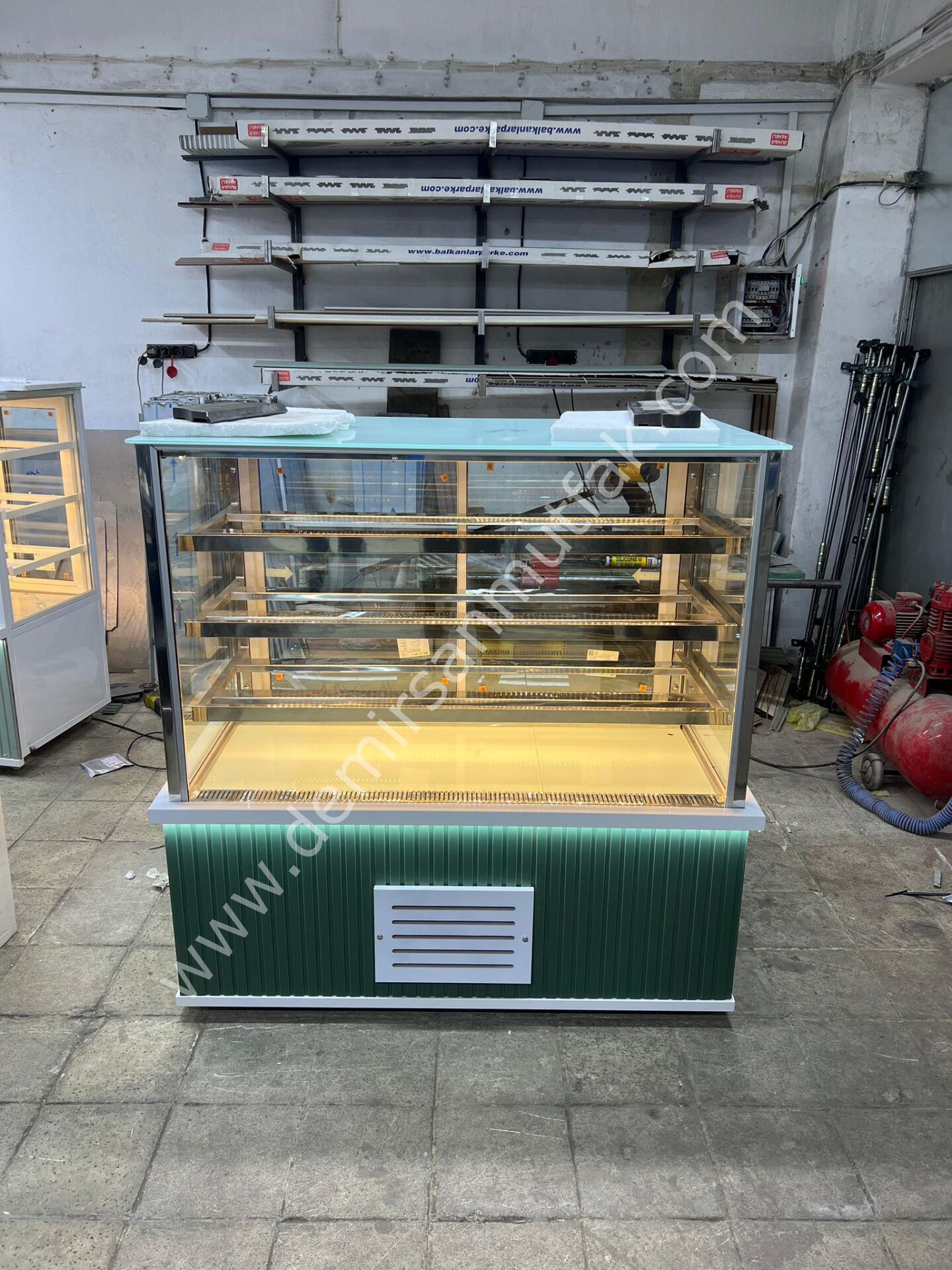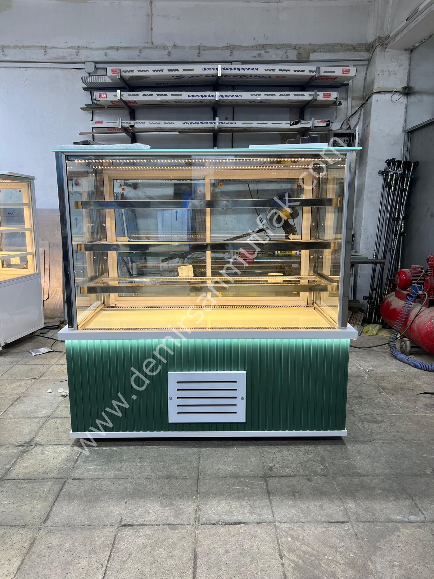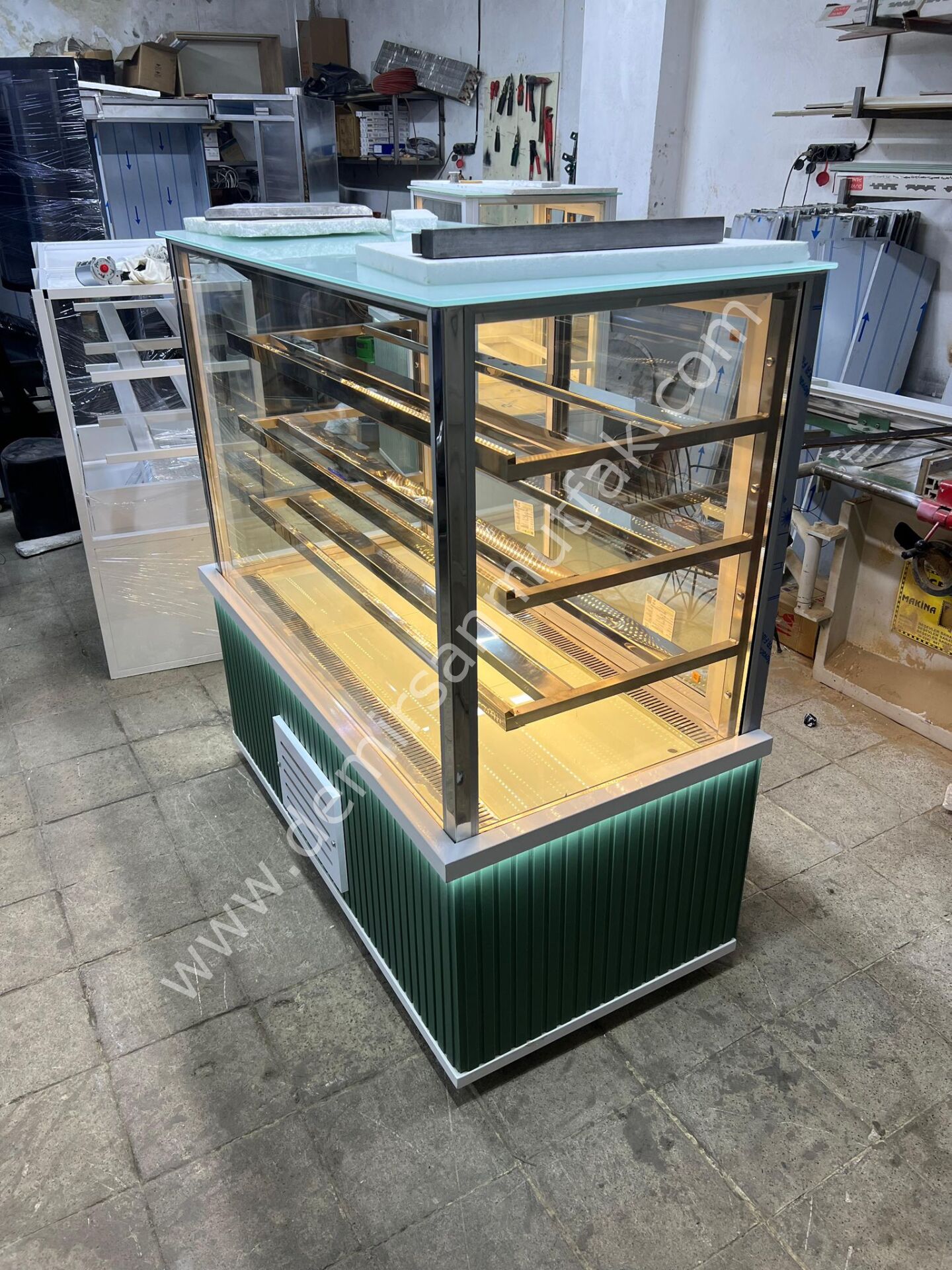Panoramik cam yapısı ürünlerin her açıdan görünmesini sağlarken, iç LED aydınlatma tatlılarınızın renklerini daha canlı göstererek müşteri ilgisini artırır. Alt gövdede kullanılan modern yeşil dekor tasarımı işletmenize premium bir atmosfer kazandırır ve vitrininizi rakiplerinizden görsel olarak ayrıştırır.