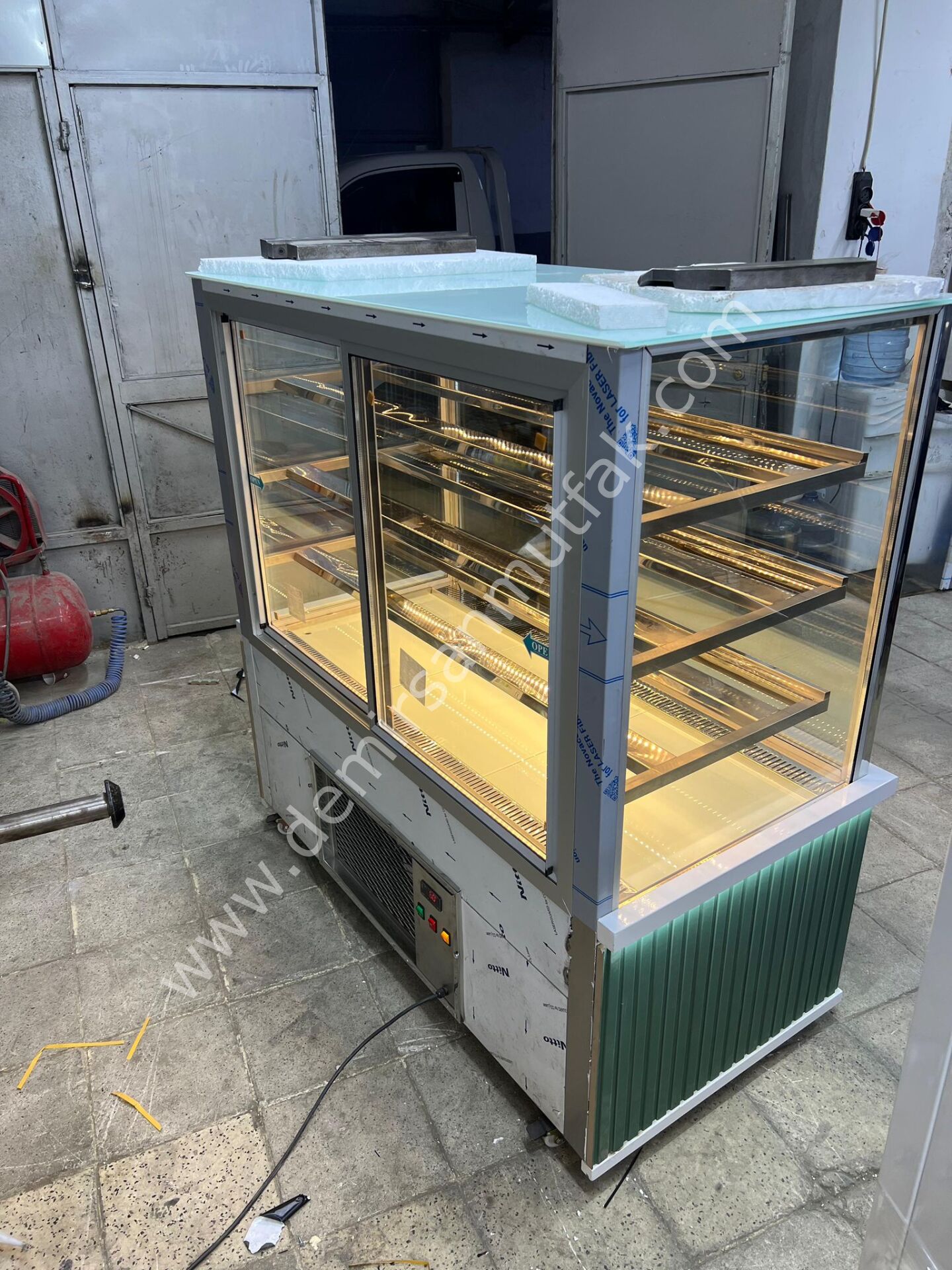 Pastane, kafe ve tatlı satış noktaları için özel olarak tasarlanan Geniş Camlı Yeşil Dekorlu Pasta Tatlı Teşhir Dolabı DM042, ürünlerinizi hem estetik hem de profesyonel bir şekilde sergilemenizi sağlar. Geniş iç hacmi sayesinde pasta, sütlü tatlılar, cheesecake, monoporsiyon tatlılar ve çikolata çeşitleri için ideal kullanım sunar.