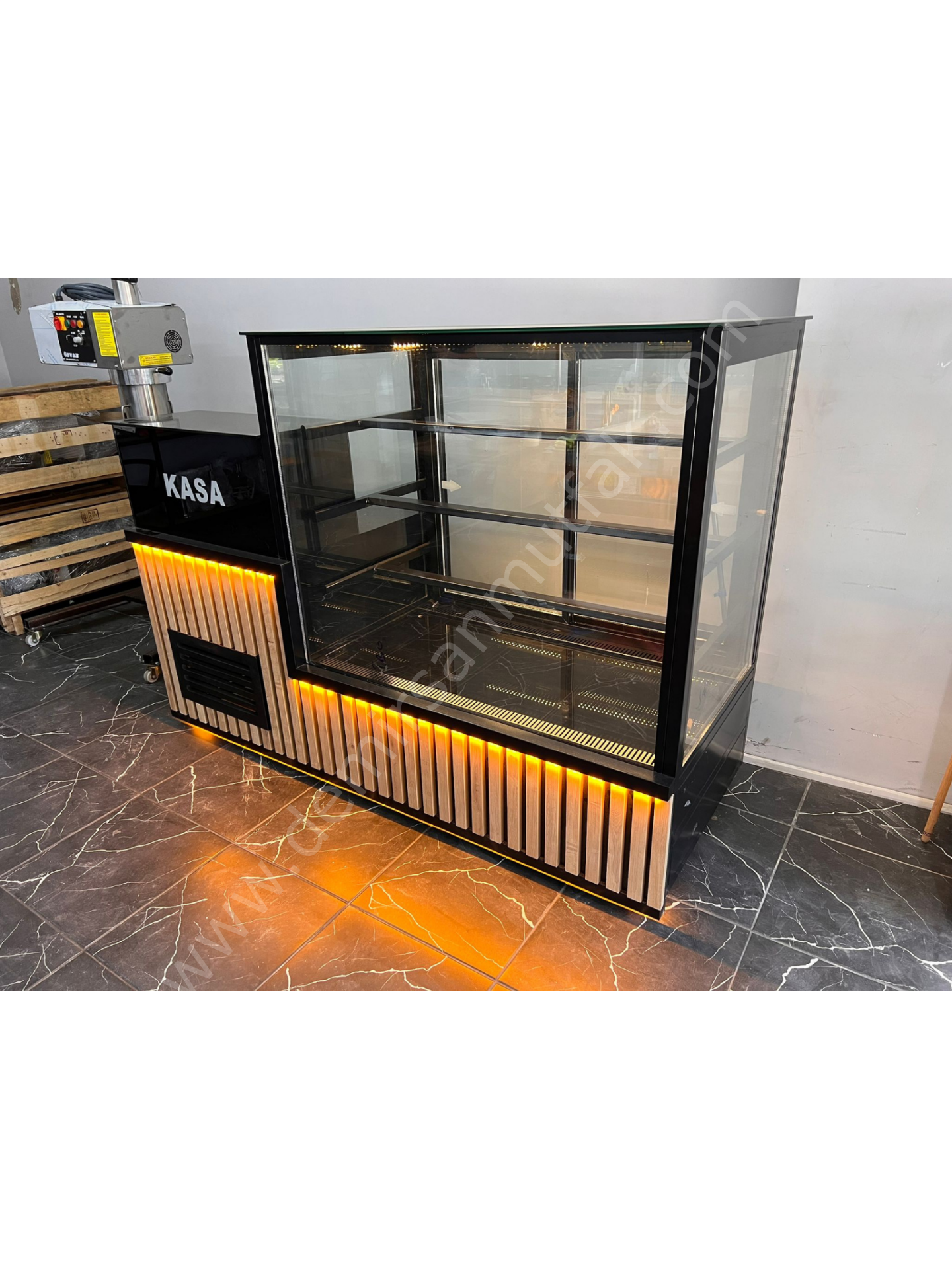 Pasta ve tatlı ürünlerinin hijyenik, düzenli ve dikkat çekici şekilde sergilenmesi için tasarlanan kasa modüllü pasta tatlı teşhir dolabı, modern tasarım çizgileriyle satış alanlarına profesyonel bir görünüm kazandırır. Geniş cam vitrin yapısı ürünlerin maksimum görünürlükle sunulmasını sağlarken, entegre kasa bölümü işletme içi akışı hızlandırarak pratik kullanım avantajı oluşturur.