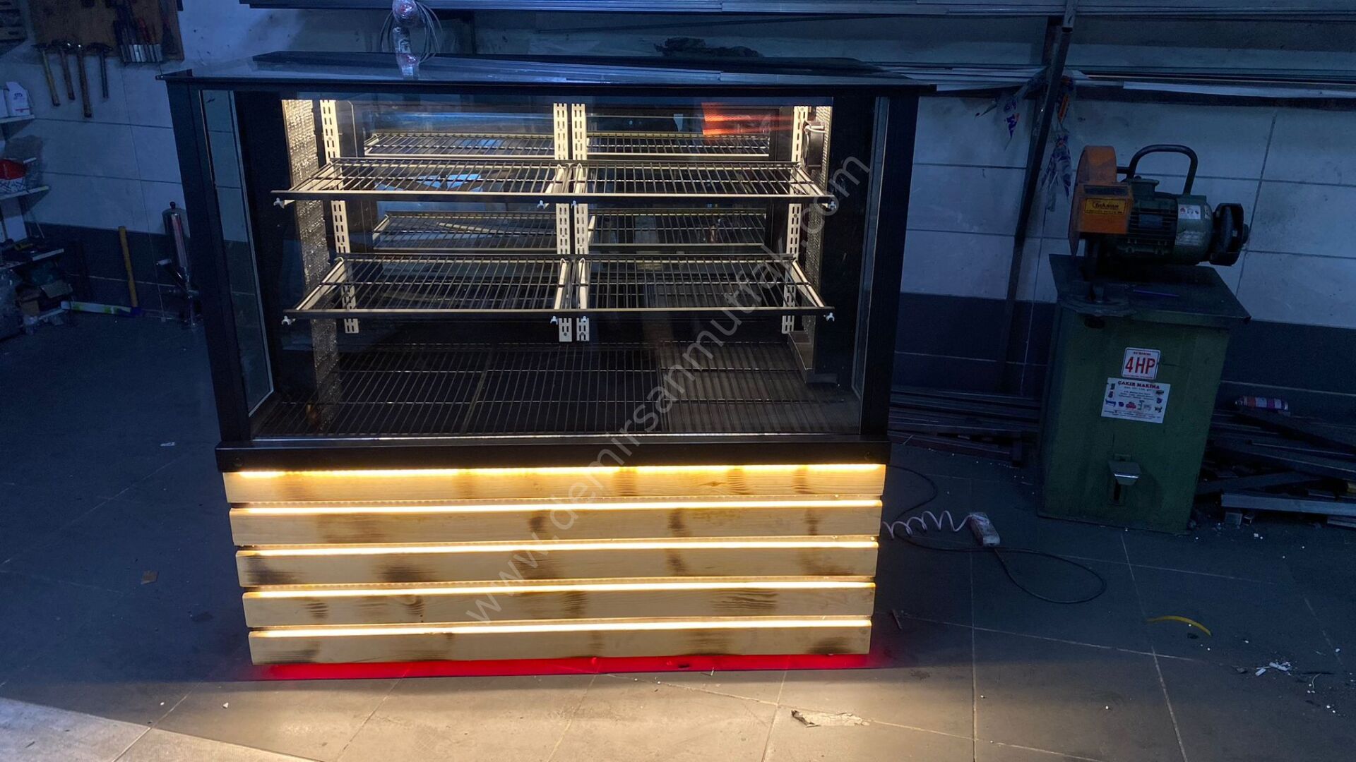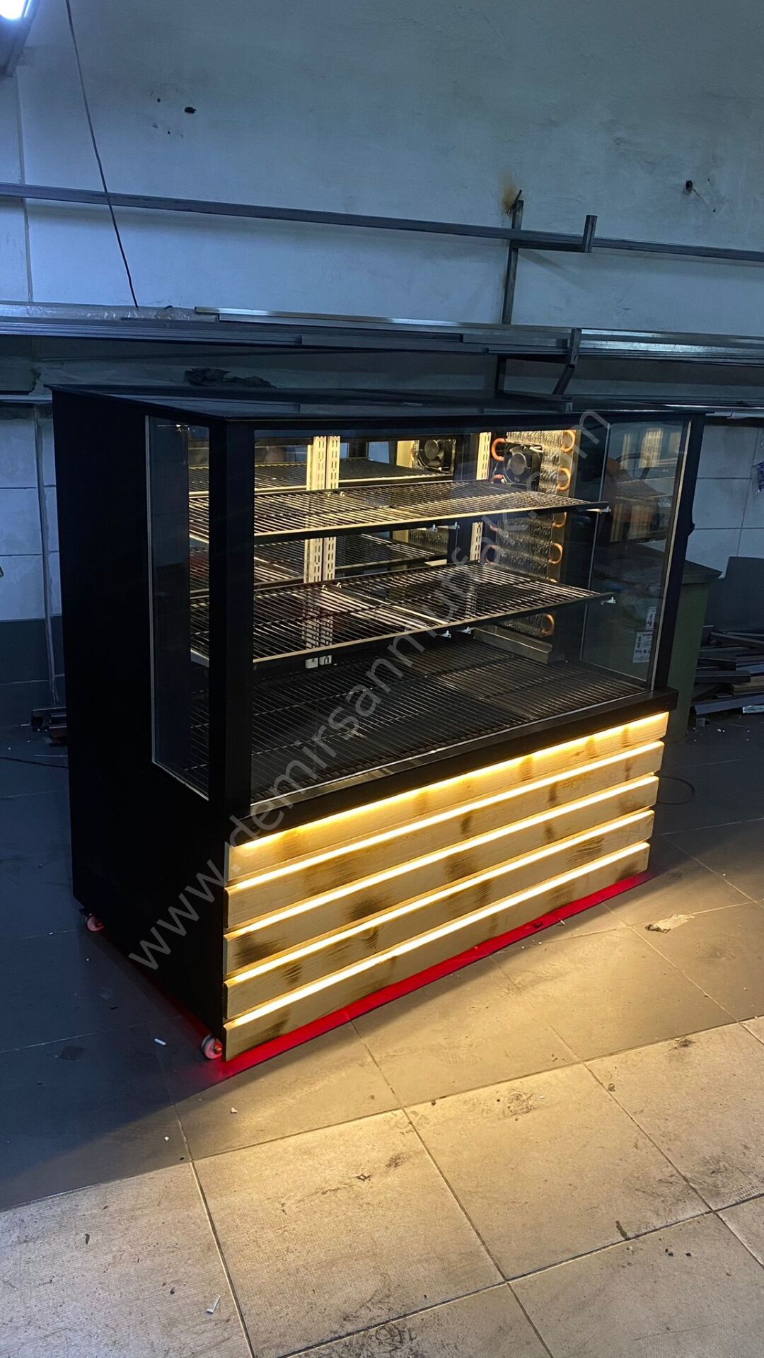 Dolabın ön kısmında kullanılan modern dekor tasarımı, sıcak LED aydınlatma ile birleşerek dikkat çekici bir ambiyans oluşturur. Ahşap görünümlü panel detayları, özellikle doğal ve samimi bir restoran atmosferi yaratmak isteyen işletmeler için önemli bir avantaj sağlar. Müşteri vitrinin önünden geçtiğinde ürünleri net biçimde görebilir ve bu görsel temas satın alma kararını hızlandırır. Günümüzde teşhir gücü yüksek ekipmanlar, restoranların rekabet avantajı elde etmesinde büyük rol oynar.