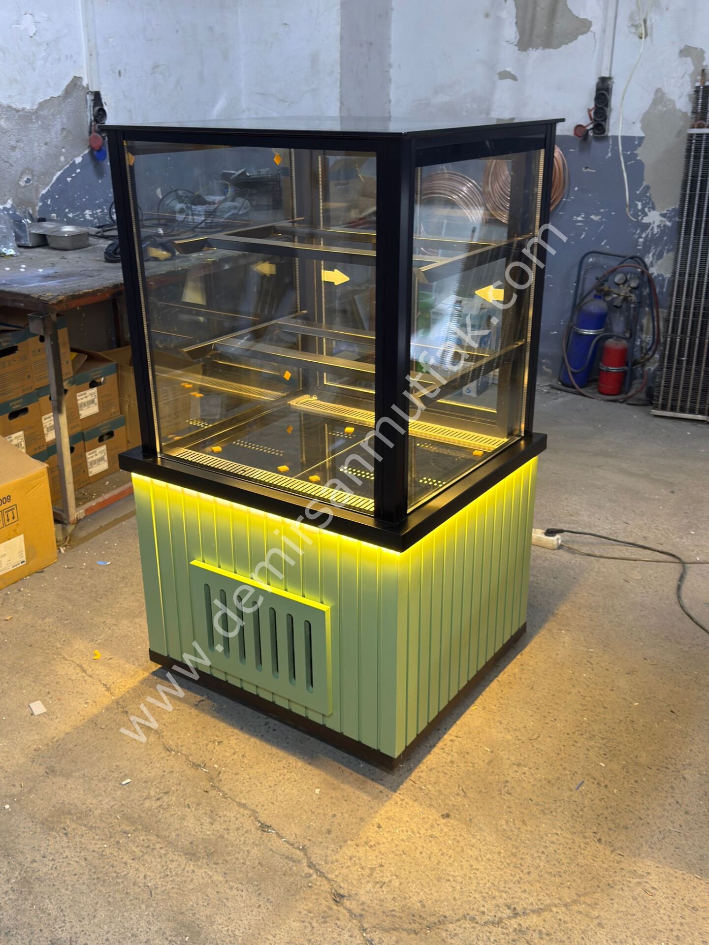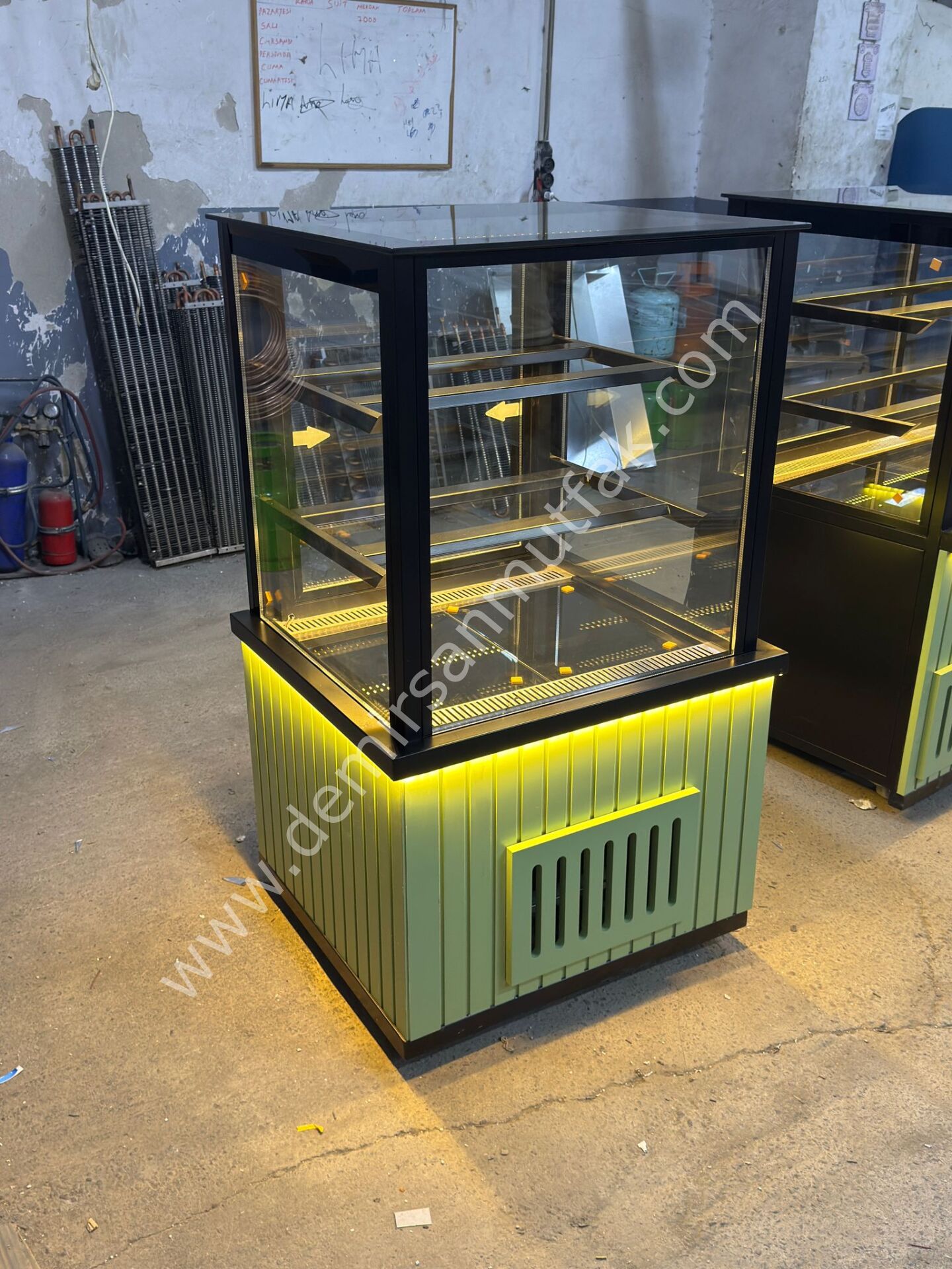 Dar alanlarda maksimum teşhir gücü sunmak üzere tasarlanan bu pasta tatlı dolabı, modern görünümü ve fonksiyonel yapısıyla işletmelere hem estetik hem de verimli bir sunum alanı kazandırır. Soft yeşil gövde rengi ve siyah çerçeve detayları, mekâna çağdaş bir atmosfer katarken müşterilerin dikkatini doğrudan ürünlere yönlendirir.