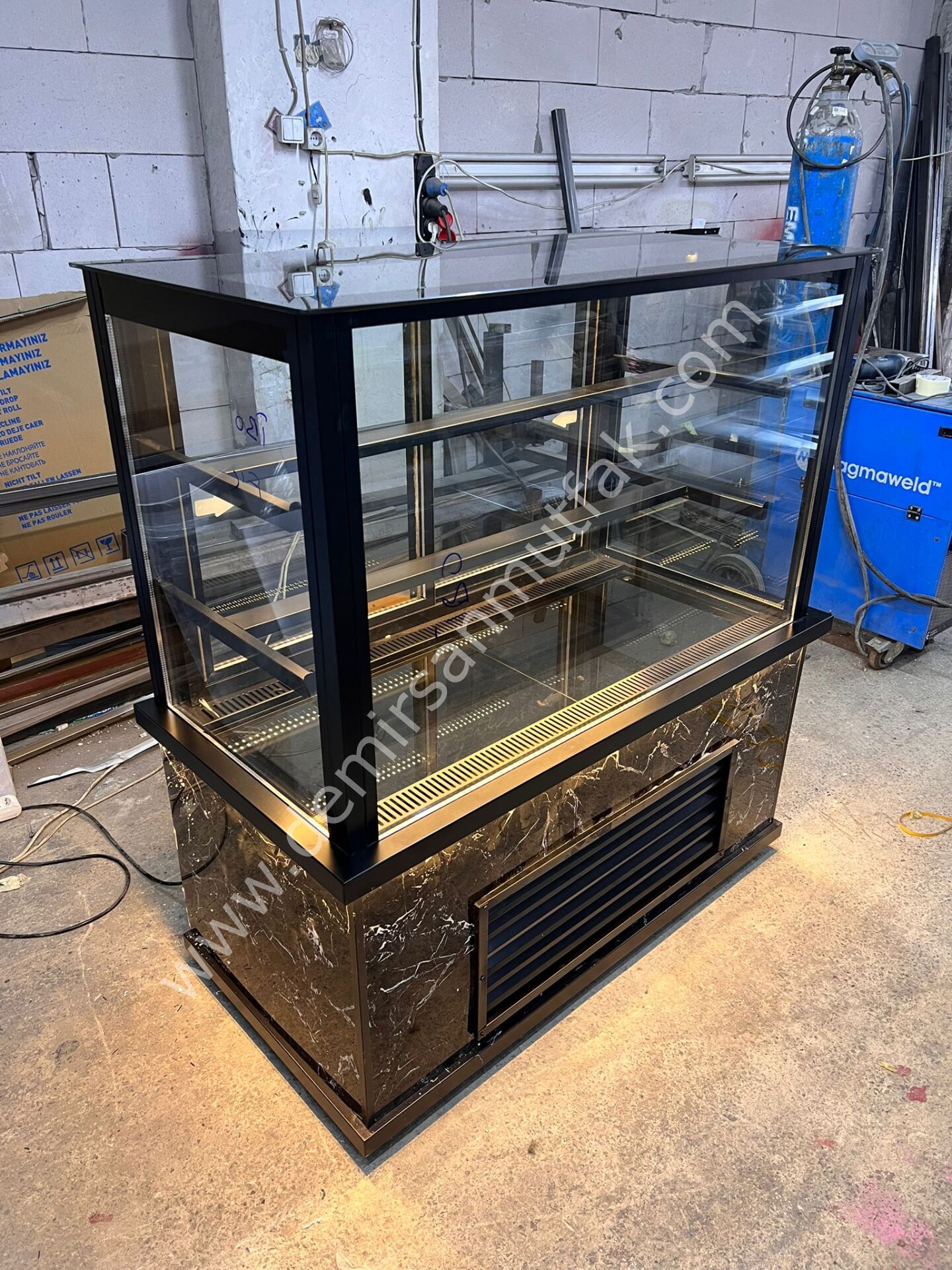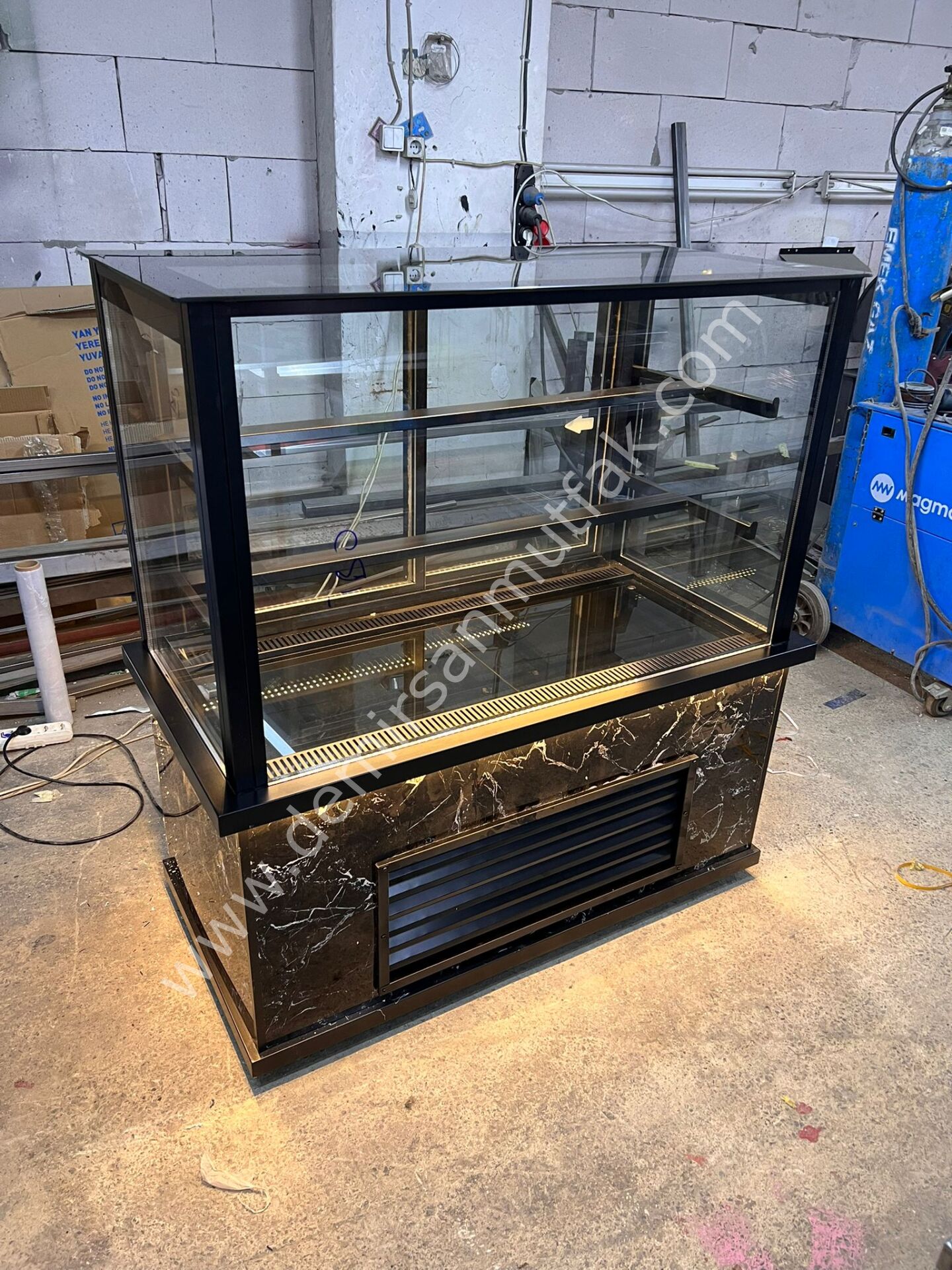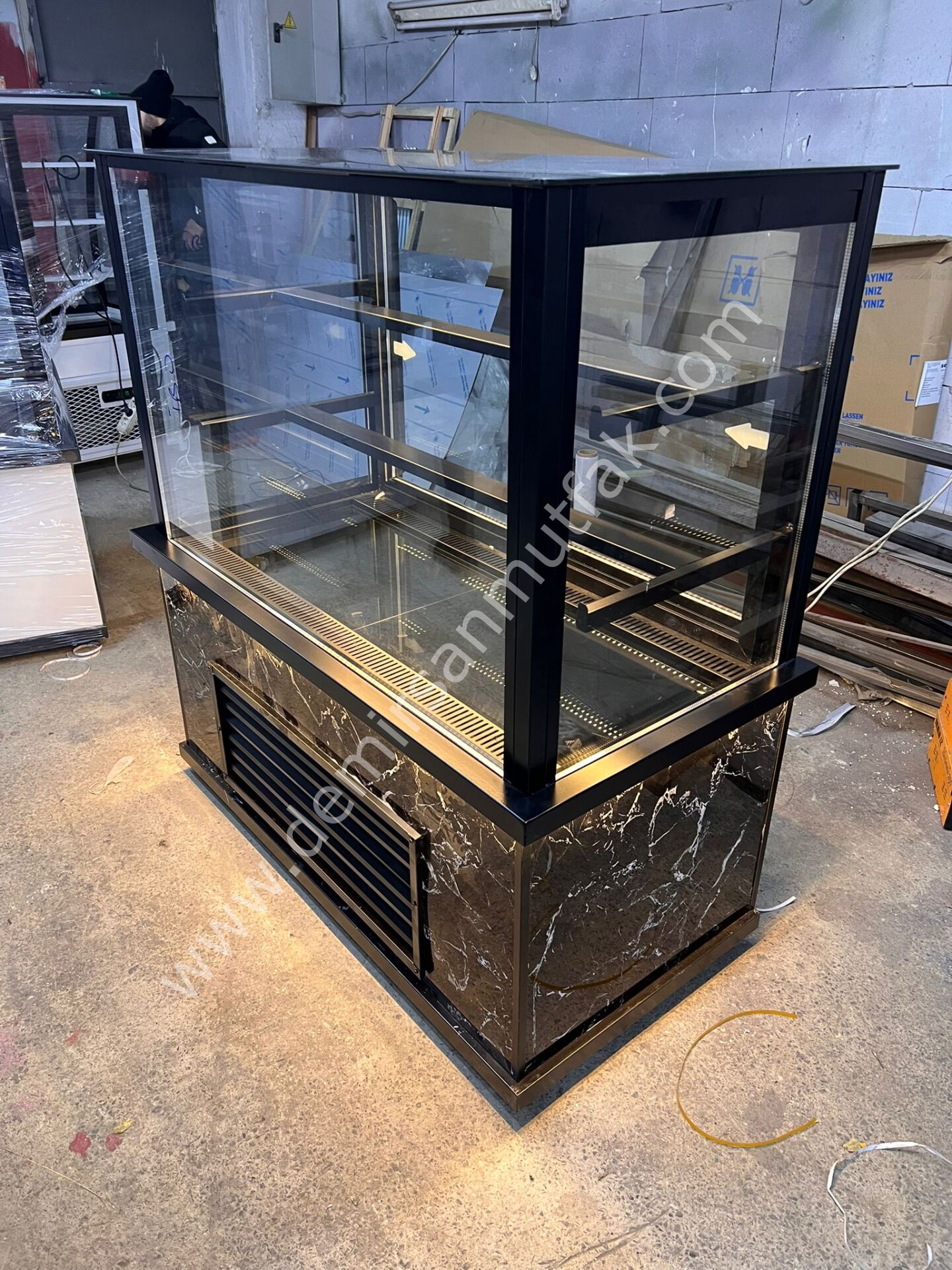 Mermer Desenli Siyah Pasta Dolabı | Düz Cam Profesyonel Pasta Teşhir Vitrini – DM019