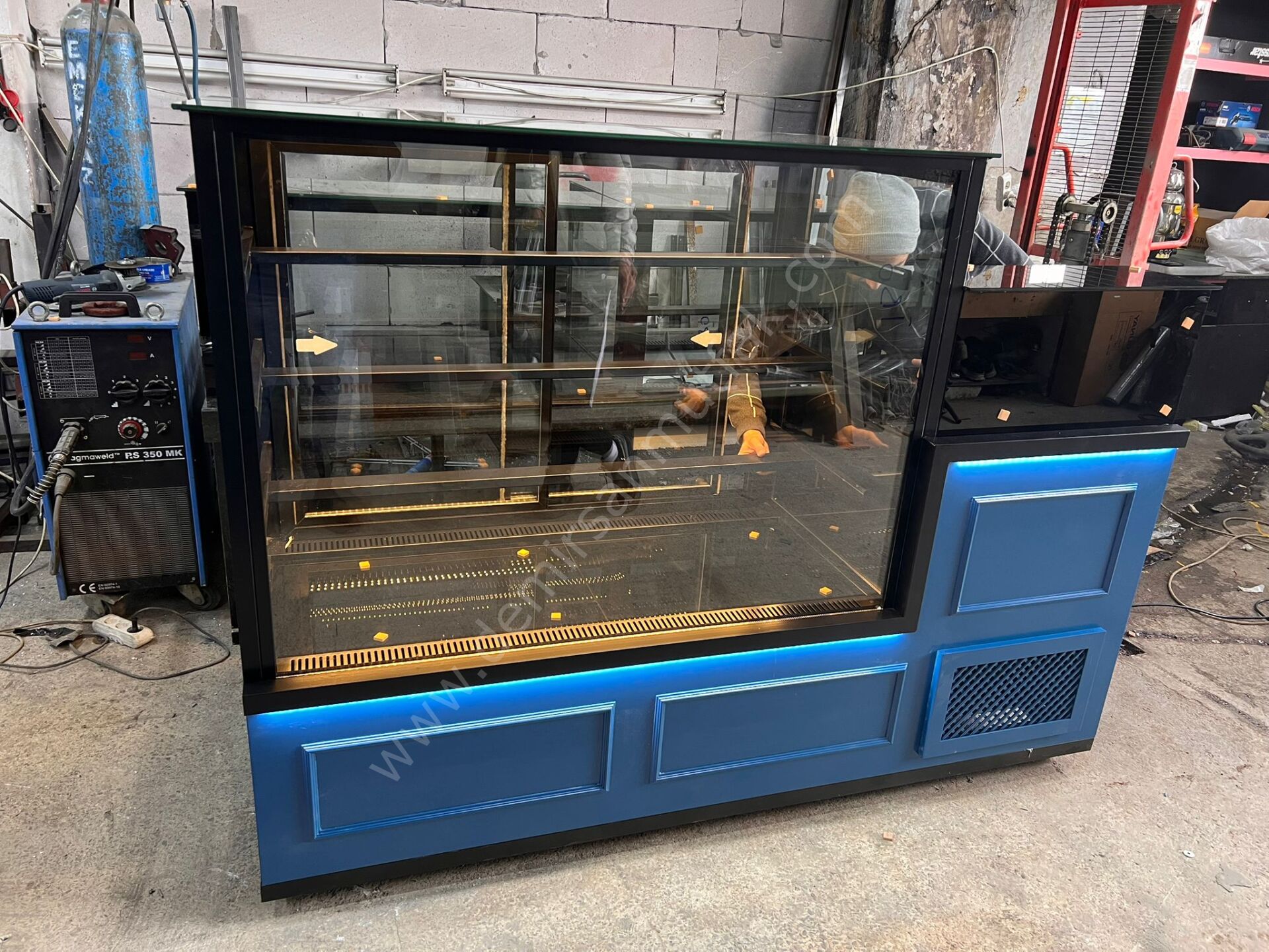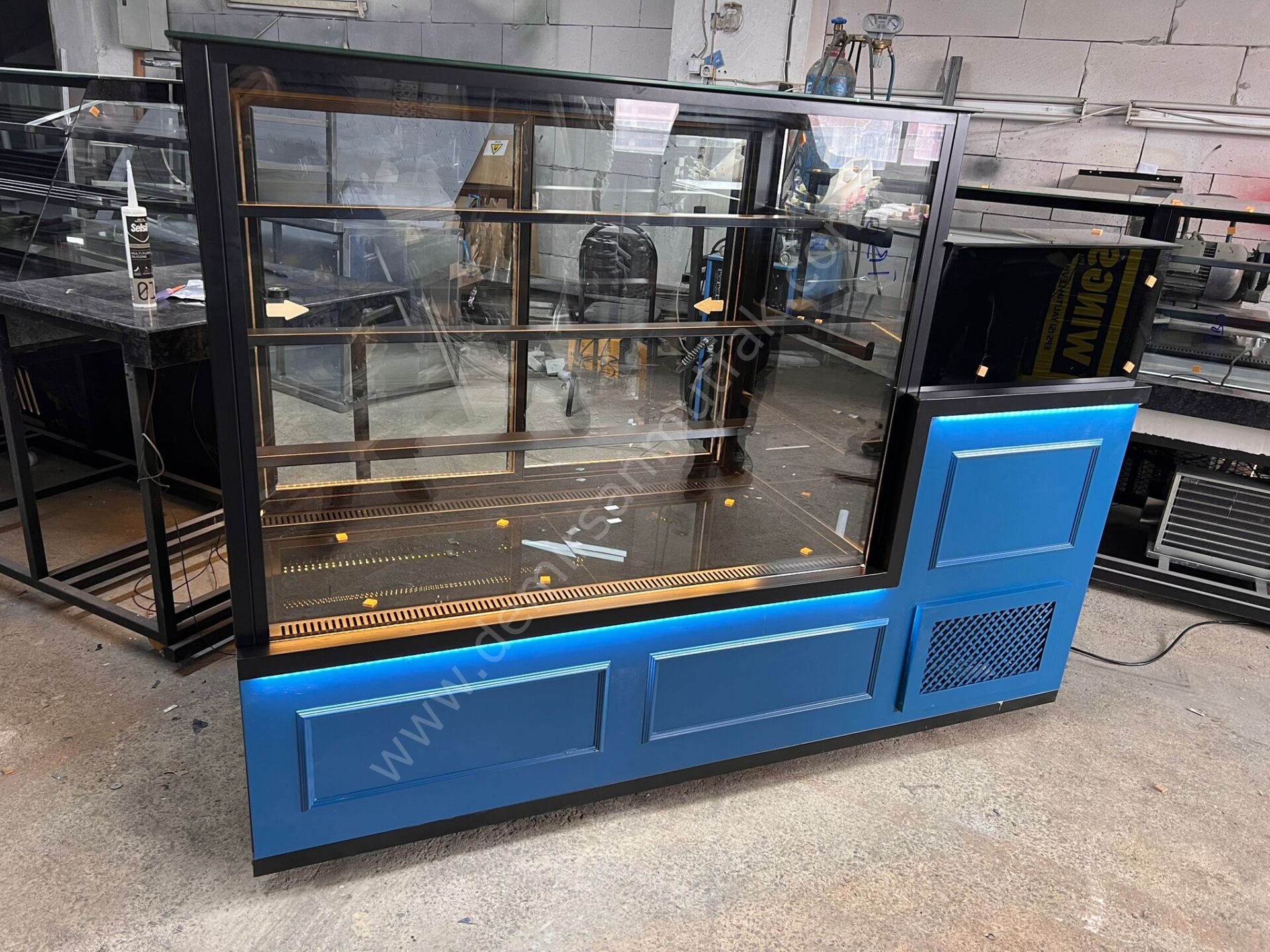 Gövdede kullanılan mat mavi ton ve çevresini saran LED aydınlatma detayı, mağaza içinde modern ve prestijli bir atmosfer yaratır. Aydınlatma sistemi ürünlerin renklerini daha canlı göstererek tazelik algısını artırır ve vitrin cazibesini güçlendirir. Siyah çerçeve tasarımı ise güncel mimari konseptlerle uyum sağlayarak mekana premium bir karakter kazandırır.