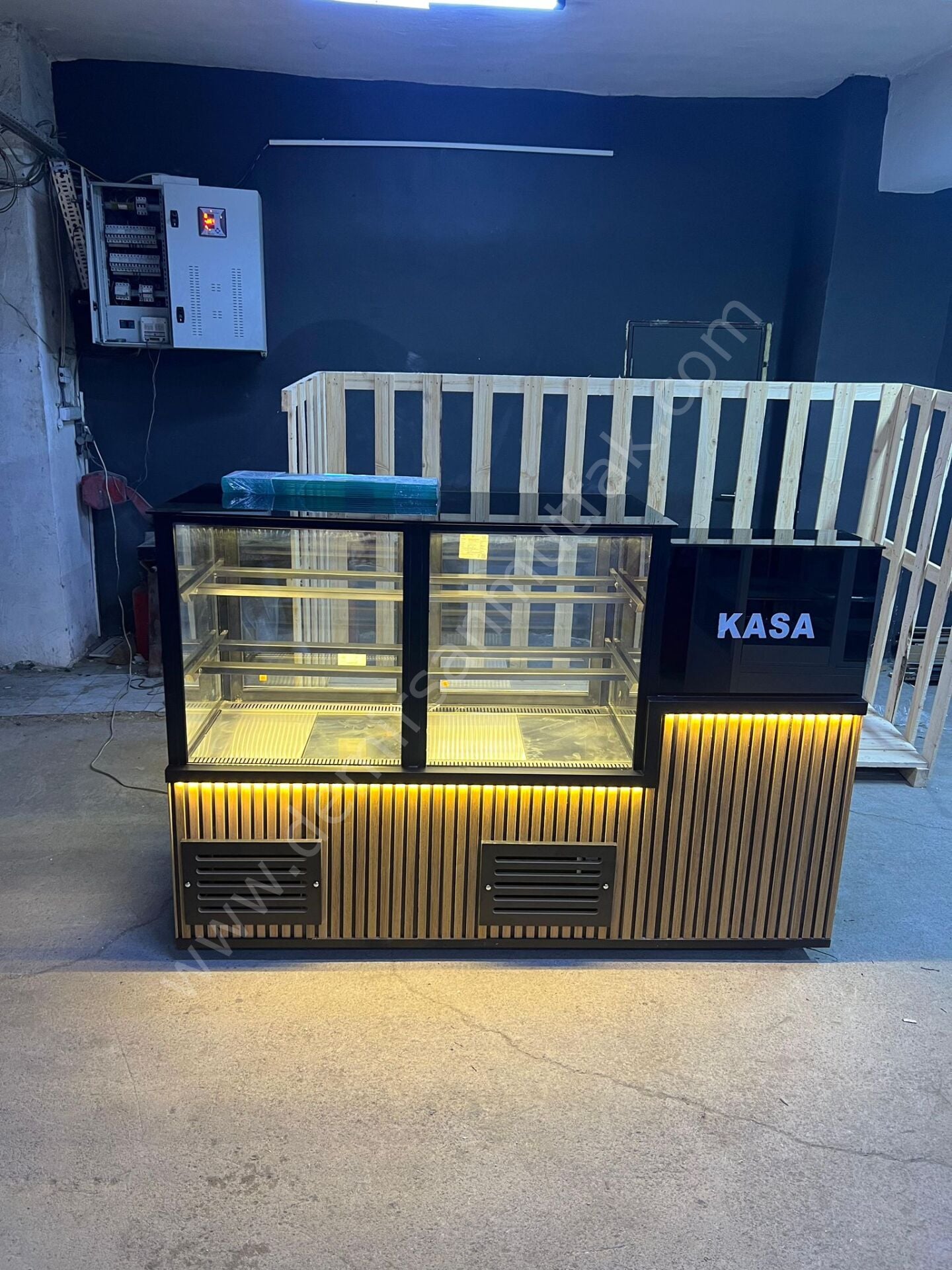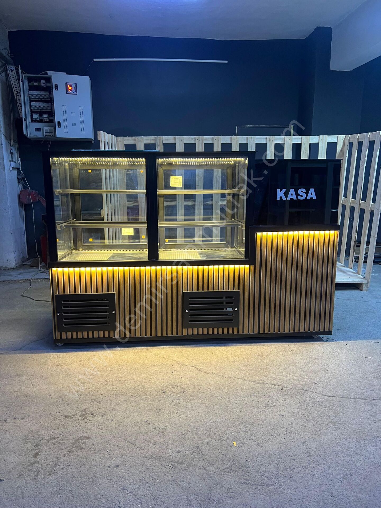 Modern Pasta Teşhir Dolabı ve Kasalı Pastane Bankosu – Ahşap Detaylı LED Aydınlatmalı DM104