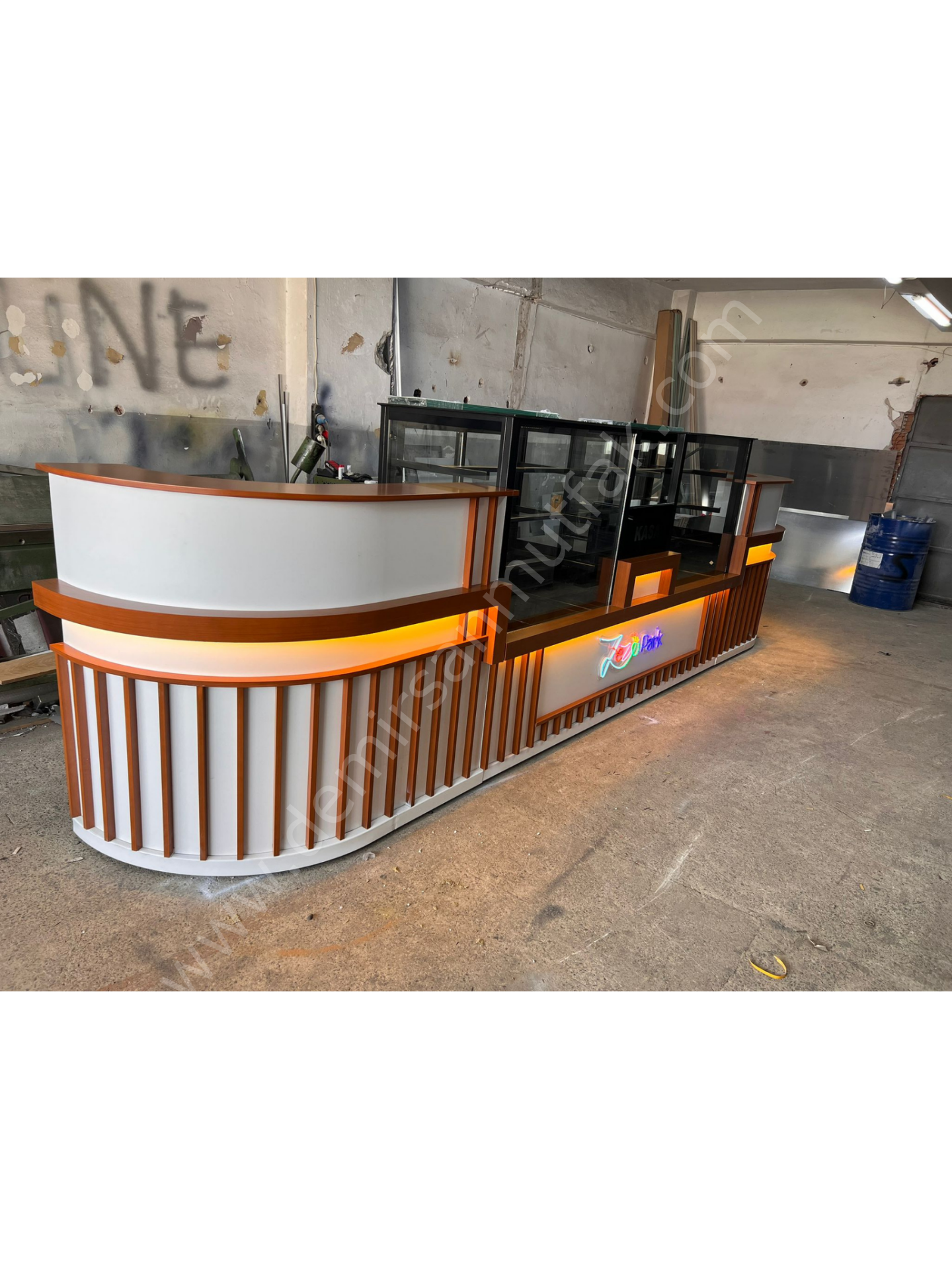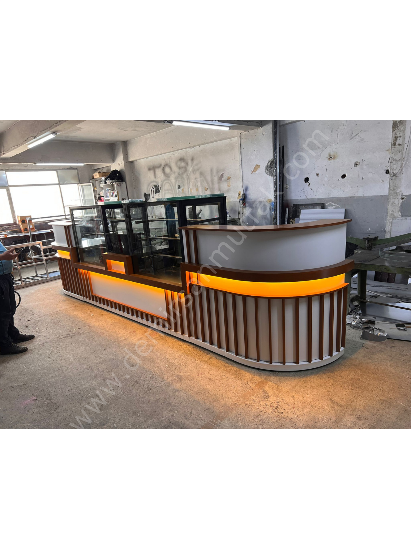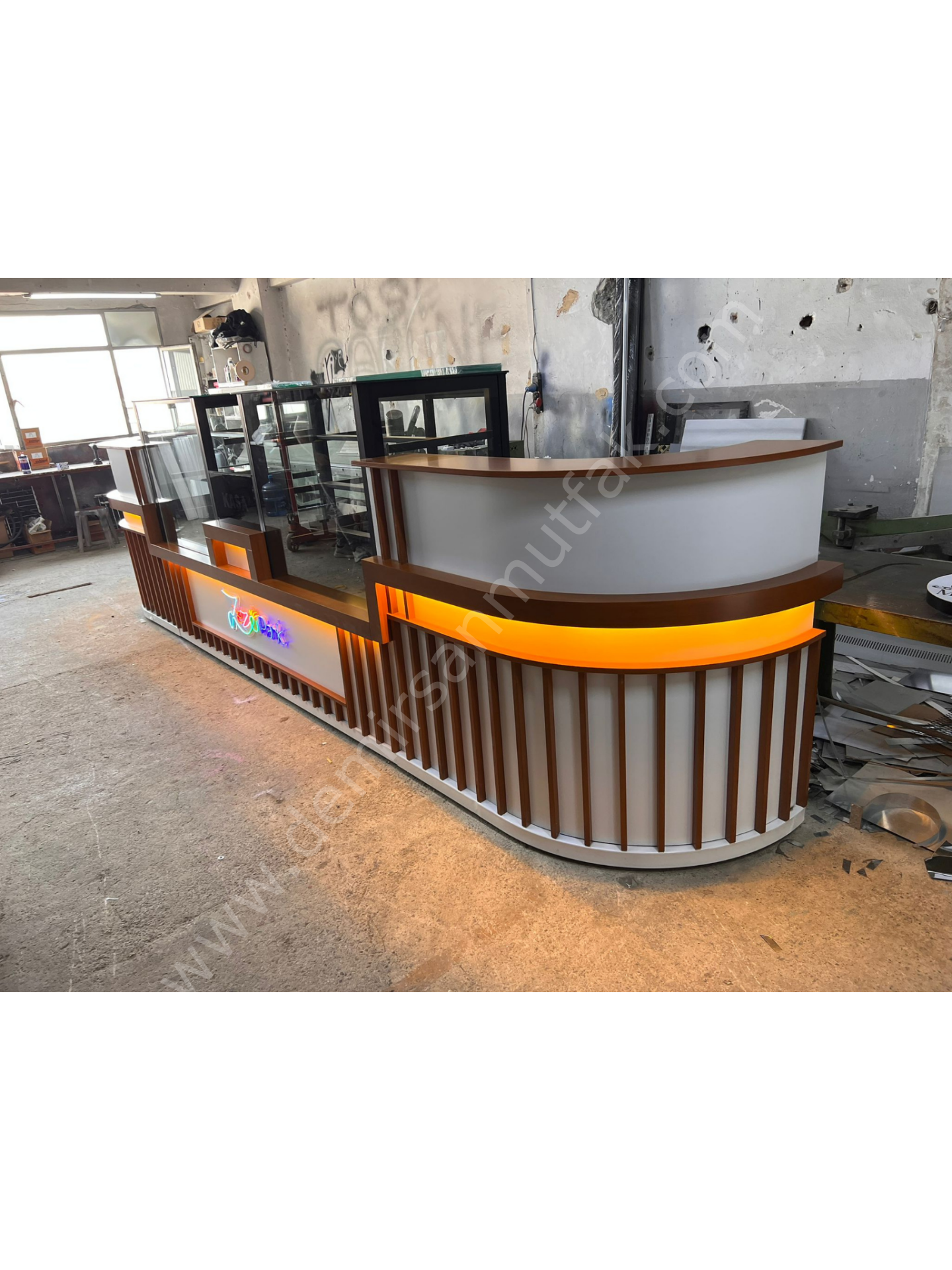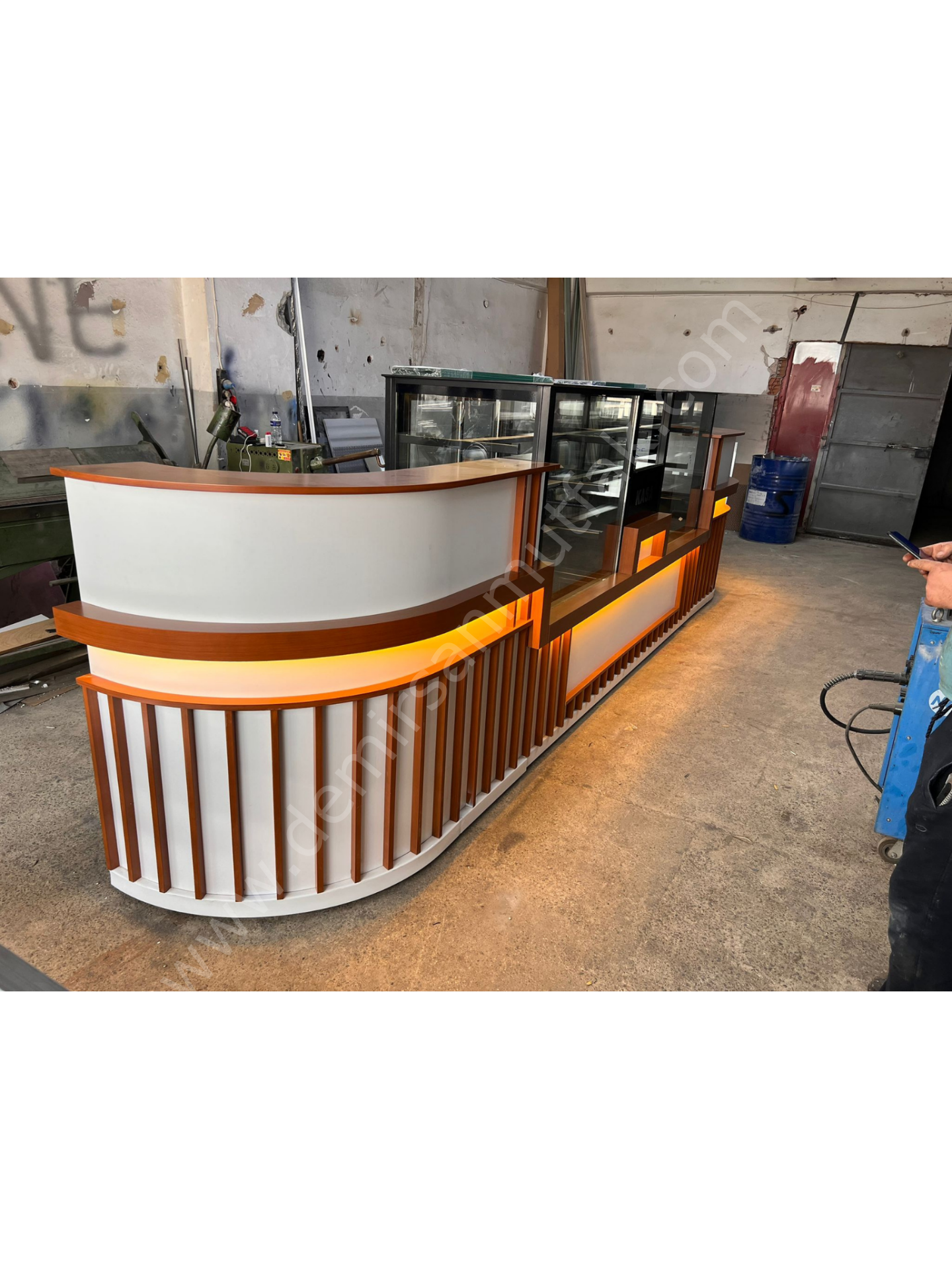 ✔ Karşılama bankosu ve teşhir dolabını bir arada sunan set tasarım