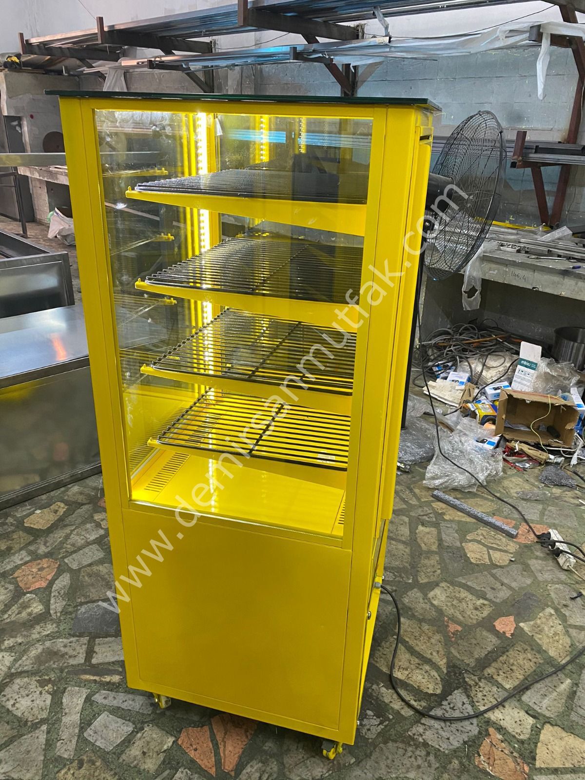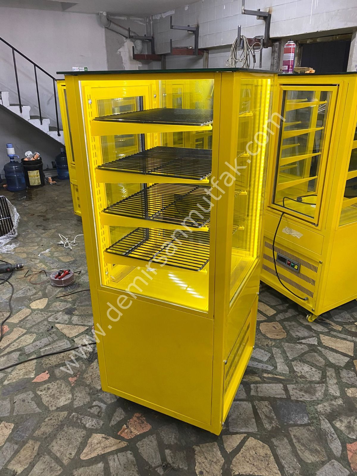 Dikkat çekici tasarımıyla vitrin gücünü artırmak isteyen işletmeler için geliştirilen bu pasta tatlı dolabı, ürünlerinizi yalnızca korumakla kalmaz aynı zamanda müşterilerin ilgisini anında üzerine çeker. Canlı sarı renk tasarımı, bulunduğu ortamda yüksek fark edilirlik sağlayarak özellikle müşteri trafiğinin yoğun olduğu alanlarda güçlü bir satış avantajı oluşturur. Dört tarafı cam yapısı sayesinde pasta, tatlı ve çikolata çeşitleri her açıdan rahatlıkla görülebilir; bu da satın alma kararını hızlandıran etkili bir teşhir alanı yaratır.