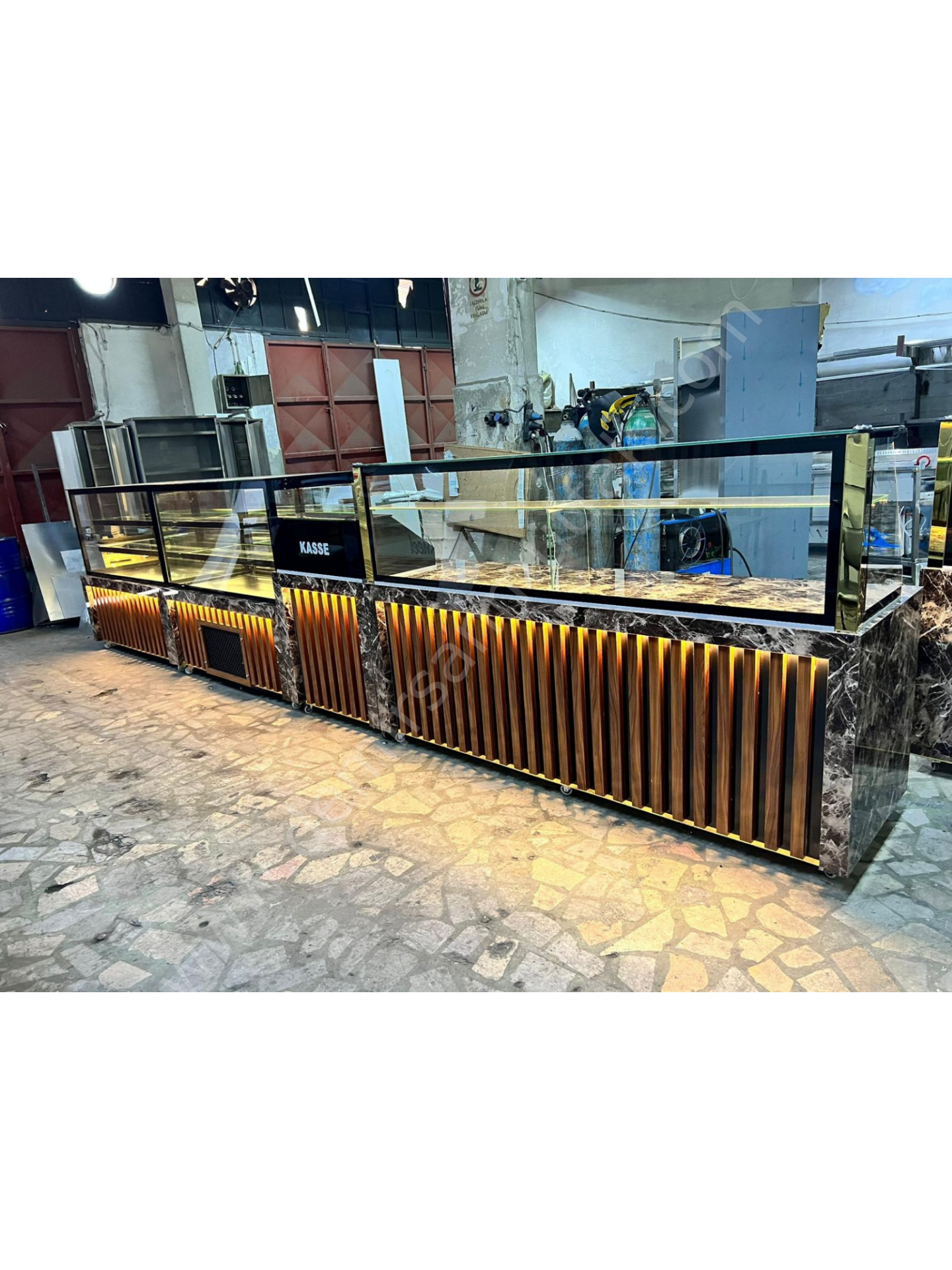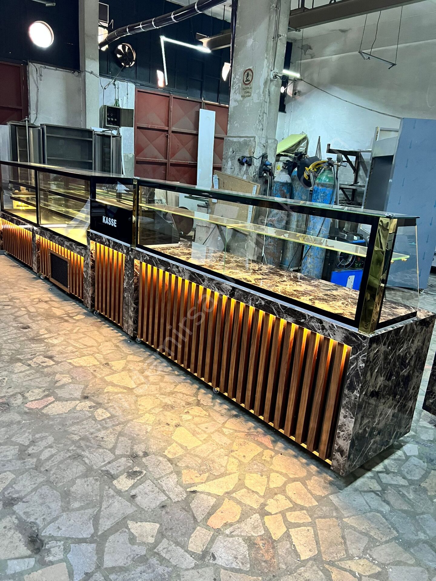 Geniş cam teşhir alanları, ürünlerin her açıdan rahatlıkla görülmesini sağlayarak maksimum görünürlük oluşturur. Özellikle vitrinden satış yapan işletmelerde bu detay, müşteri dikkatini çekerek içeri girme oranını artırabilir. Çok katmanlı raf sistemi pastaların düzenli şekilde konumlandırılmasına imkan tanırken, geniş tezgah alanı baklava ve kuru tatlı çeşitlerinin estetik biçimde sergilenmesini destekler. Bu yapı hem görsel bütünlük sağlar hem de servis hızını artırarak operasyonel süreçleri kolaylaştırır.