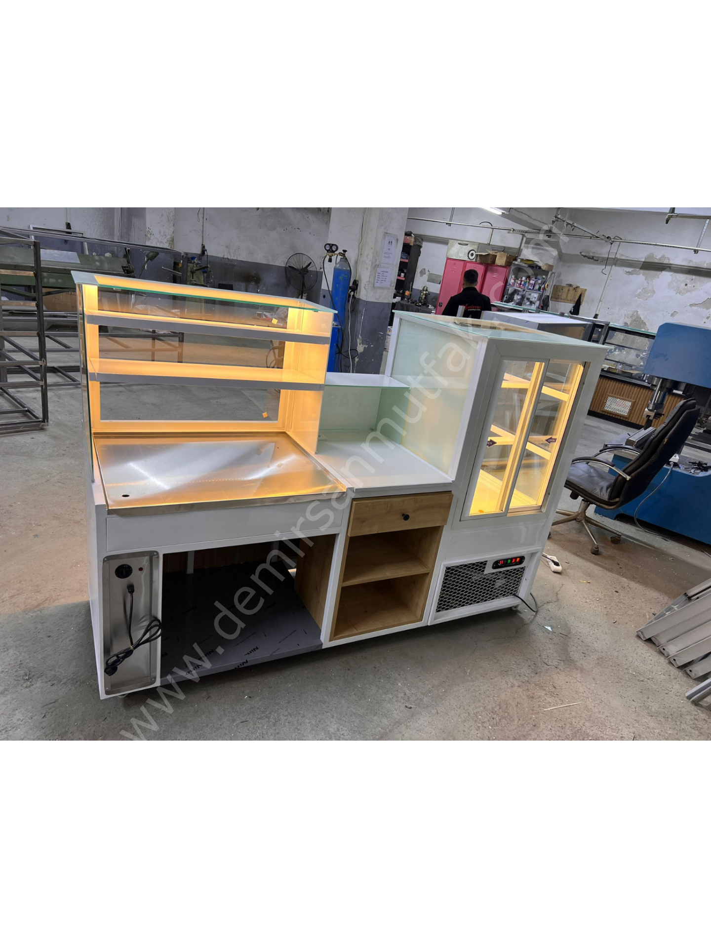 Pastane ve kafe konseptli işletmelerde ürünlerin doğru şekilde konumlandırılması, hem görsel sunumu güçlendirir hem de satış performansını doğrudan etkiler. Pasta Tatlı Dolabı ve Börek Tezgahı; farklı ürün gruplarını tek bir servis hattında buluşturan tasarımıyla işletmelere düzenli, profesyonel ve dikkat çekici bir teşhir alanı kazandırmak için geliştirilmiştir.