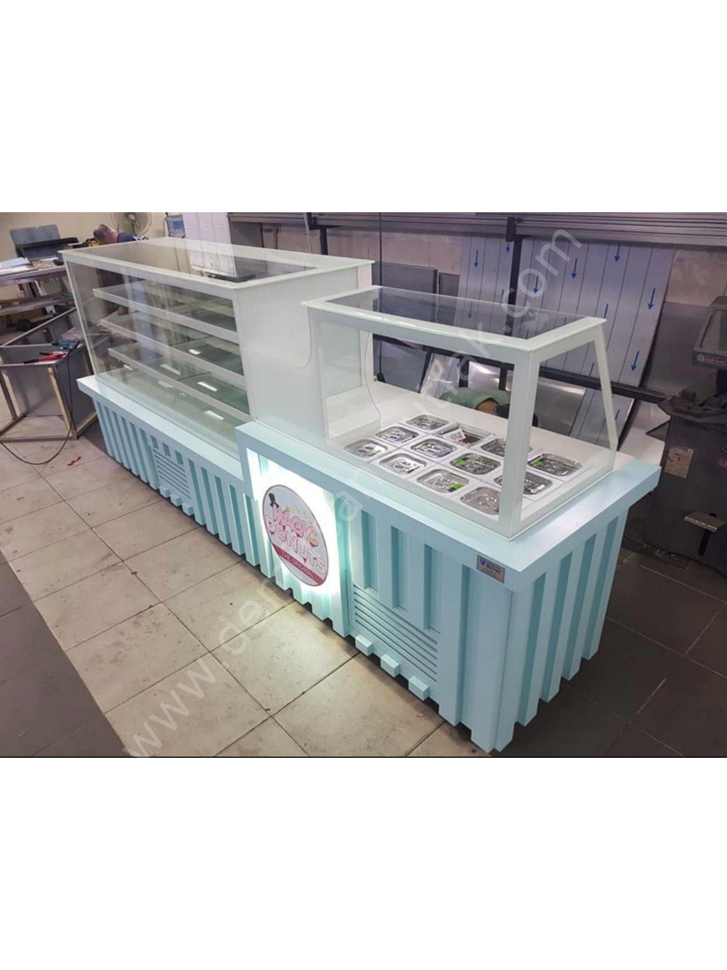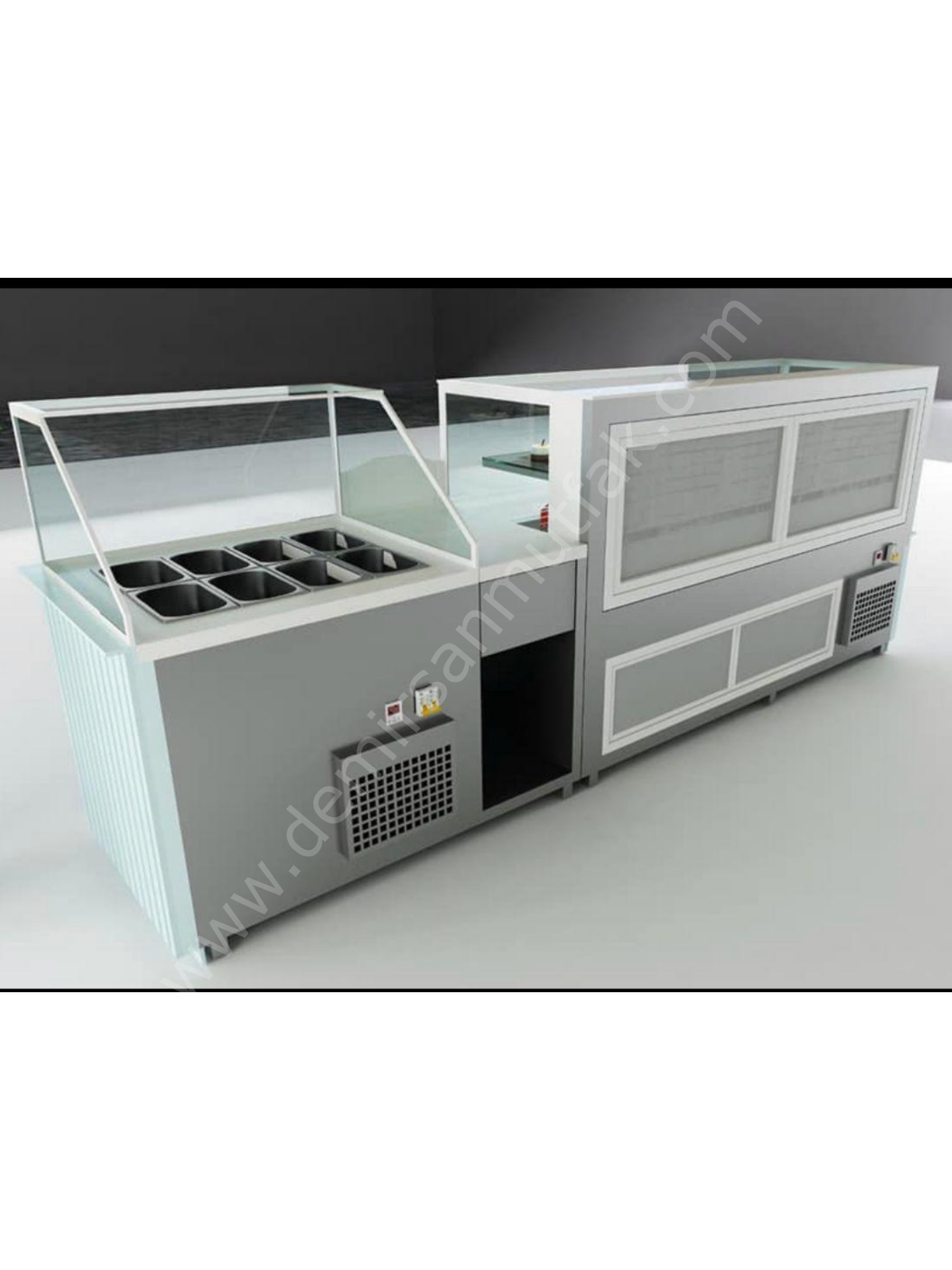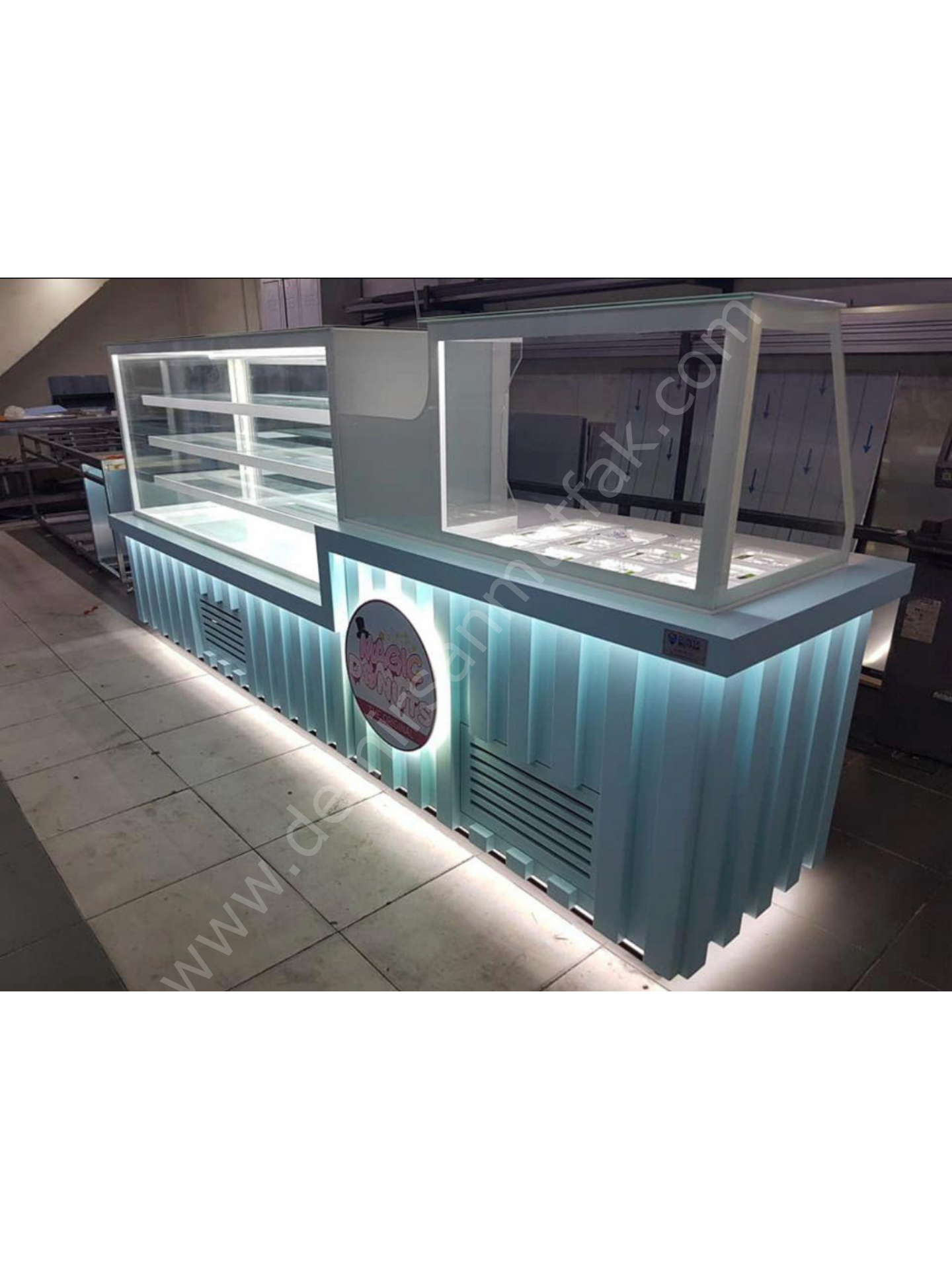 Modern çizgilere sahip dekoratif gövde tasarımı ve alt bölümde kullanılan ambiyans aydınlatma, işletmenize premium bir görünüm kazandırırken müşteri algısını güçlendirir. Ergonomik servis alanı ise personelin hızlı ve rahat çalışmasını destekleyerek yoğun saatlerde operasyonel avantaj sağlar.