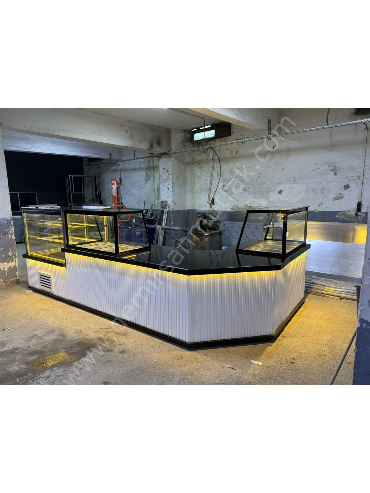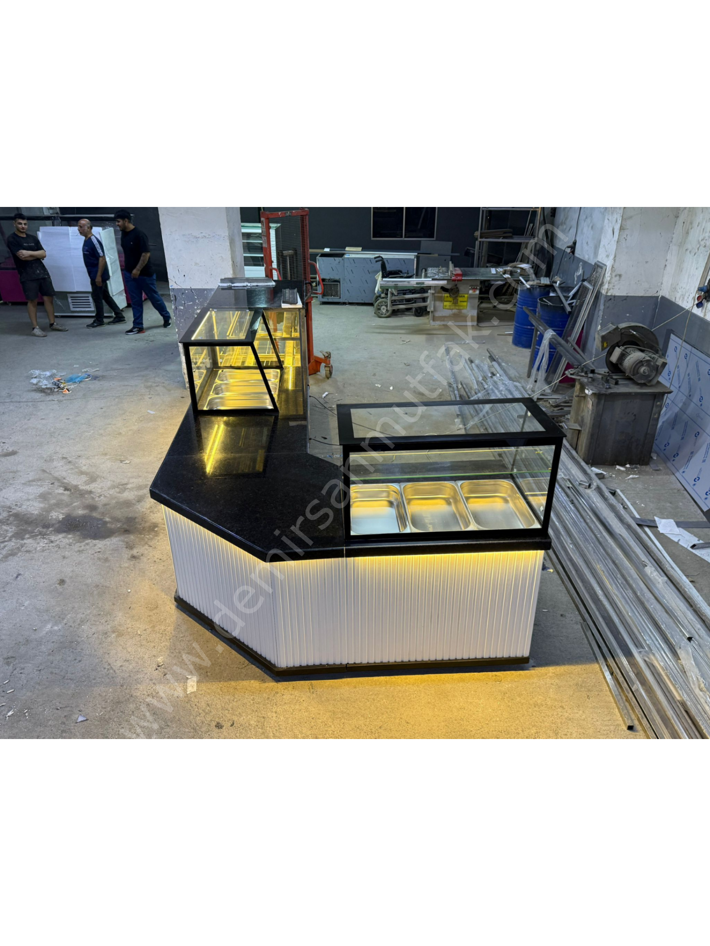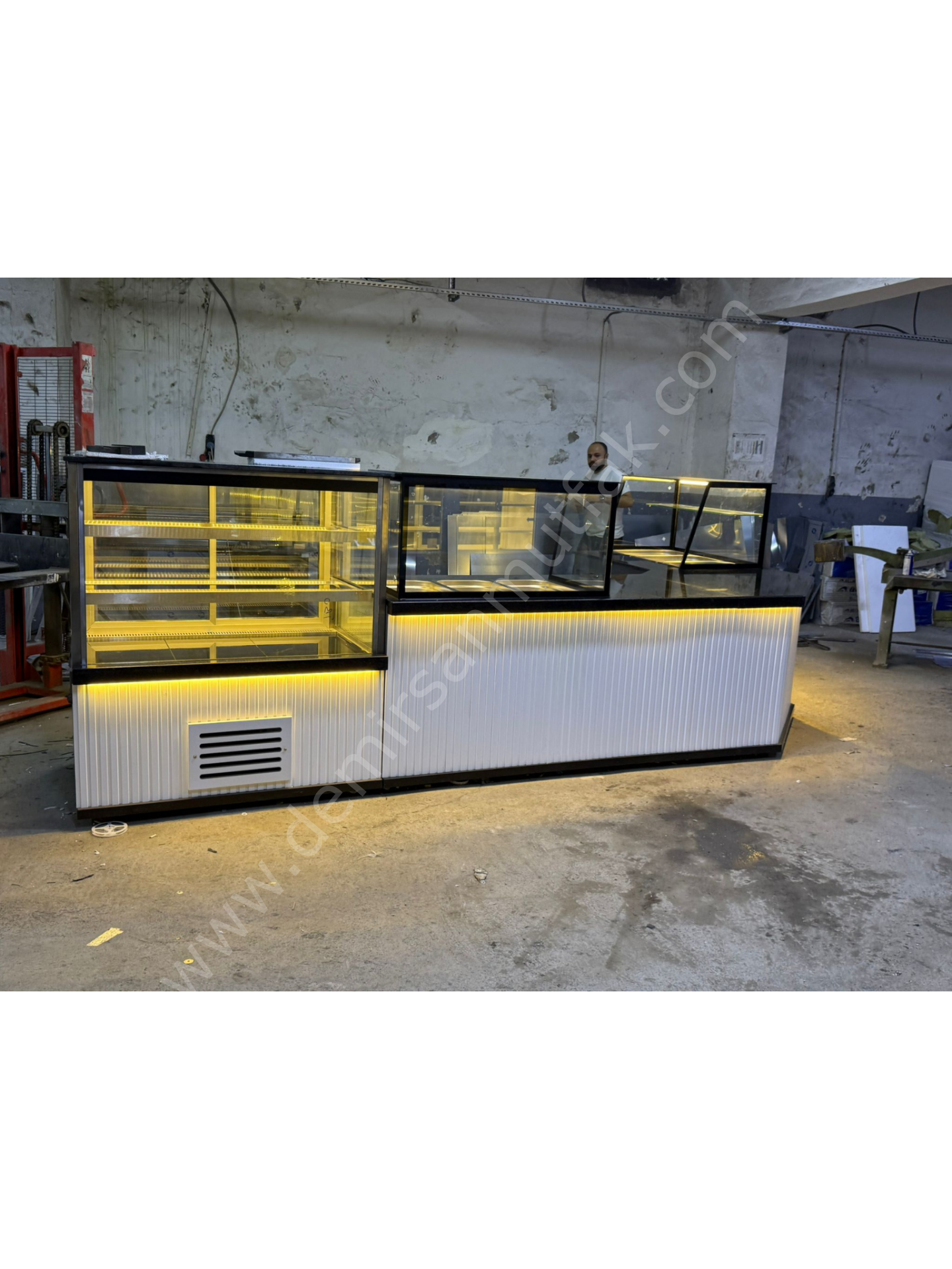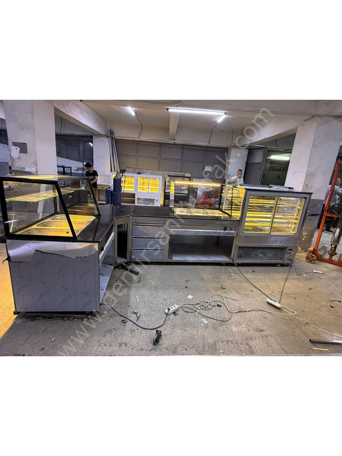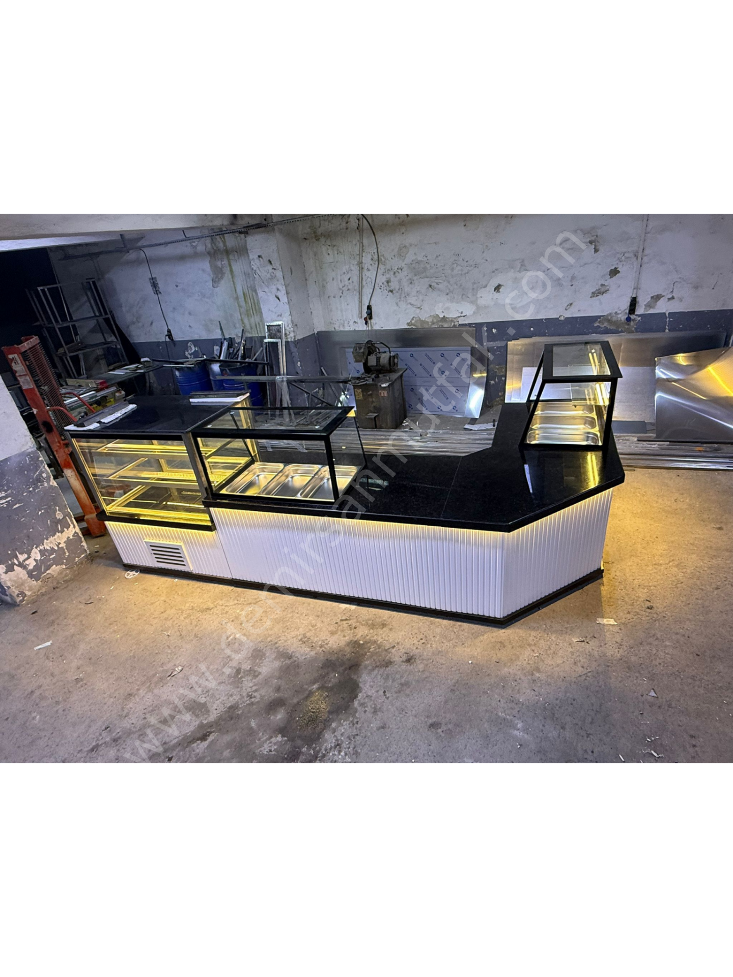 Set içerisinde yer alan geniş cam vitrin bölümü pasta ve tatlıların maksimum görünürlükle sunulmasını sağlarken, entegre sıcak yemek alanı gün boyu servis edilen ürünlerin ideal sunum sıcaklığını korumaya yardımcı olur. Bu yapı özellikle paket servis yoğunluğu olan işletmelerde operasyonel hız kazandırır.