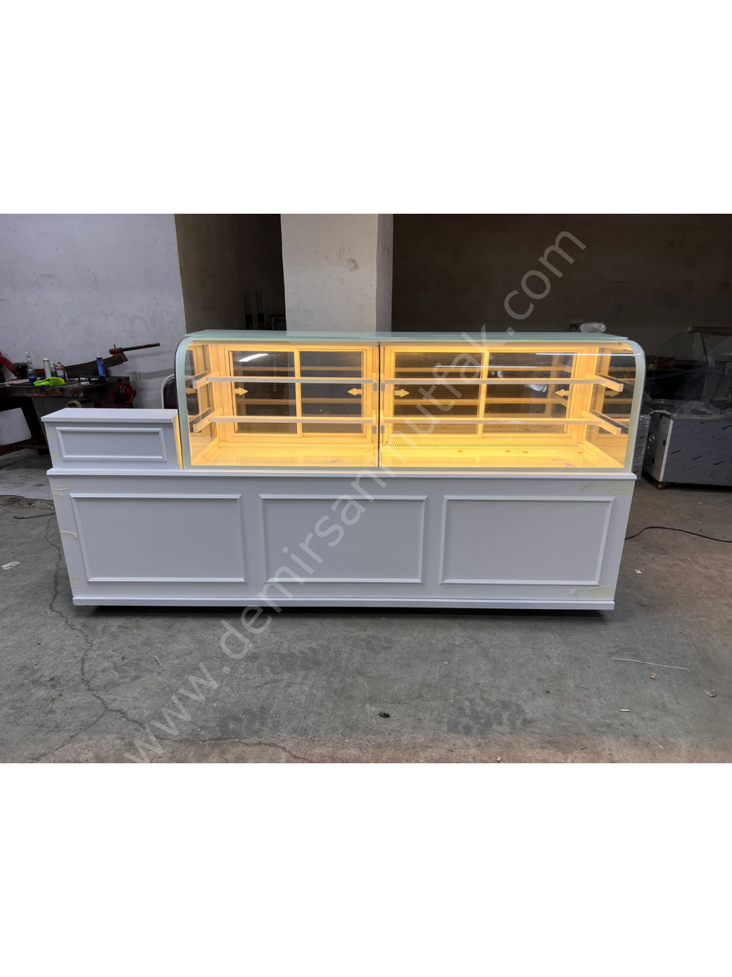 Geniş cam vitrin yapısı, pastaların her açıdan rahatlıkla görülmesini sağlayarak müşterilerin ürünleri detaylı şekilde incelemesine imkan tanır. Dengeli iç aydınlatma sistemi ise pastaların renklerini doğal ve canlı göstererek iştah açıcı bir sunum atmosferi oluşturur. Bu sayede vitrininiz yalnızca bir sergileme alanı değil, aynı zamanda satışları destekleyen güçlü bir pazarlama noktasına dönüşür.