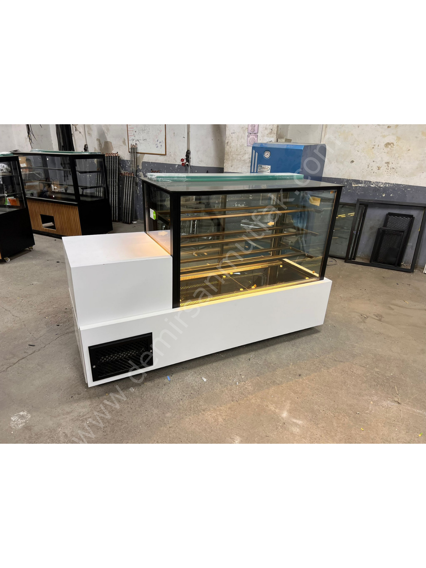 Çok katlı raf sistemi sayesinde farklı boyutlardaki pasta çeşitleri düzenli şekilde konumlandırılabilir ve her ürün net biçimde görünür. Cam panellerle çevrelenen teşhir alanı, ürünlerin her açıdan rahatça incelenmesine imkan tanıyarak müşteri ile ürün arasında güçlü bir görsel etkileşim oluşturur. Bu sayede vitrin önünde geçirilen süre artar ve satın alma eğilimi desteklenir.