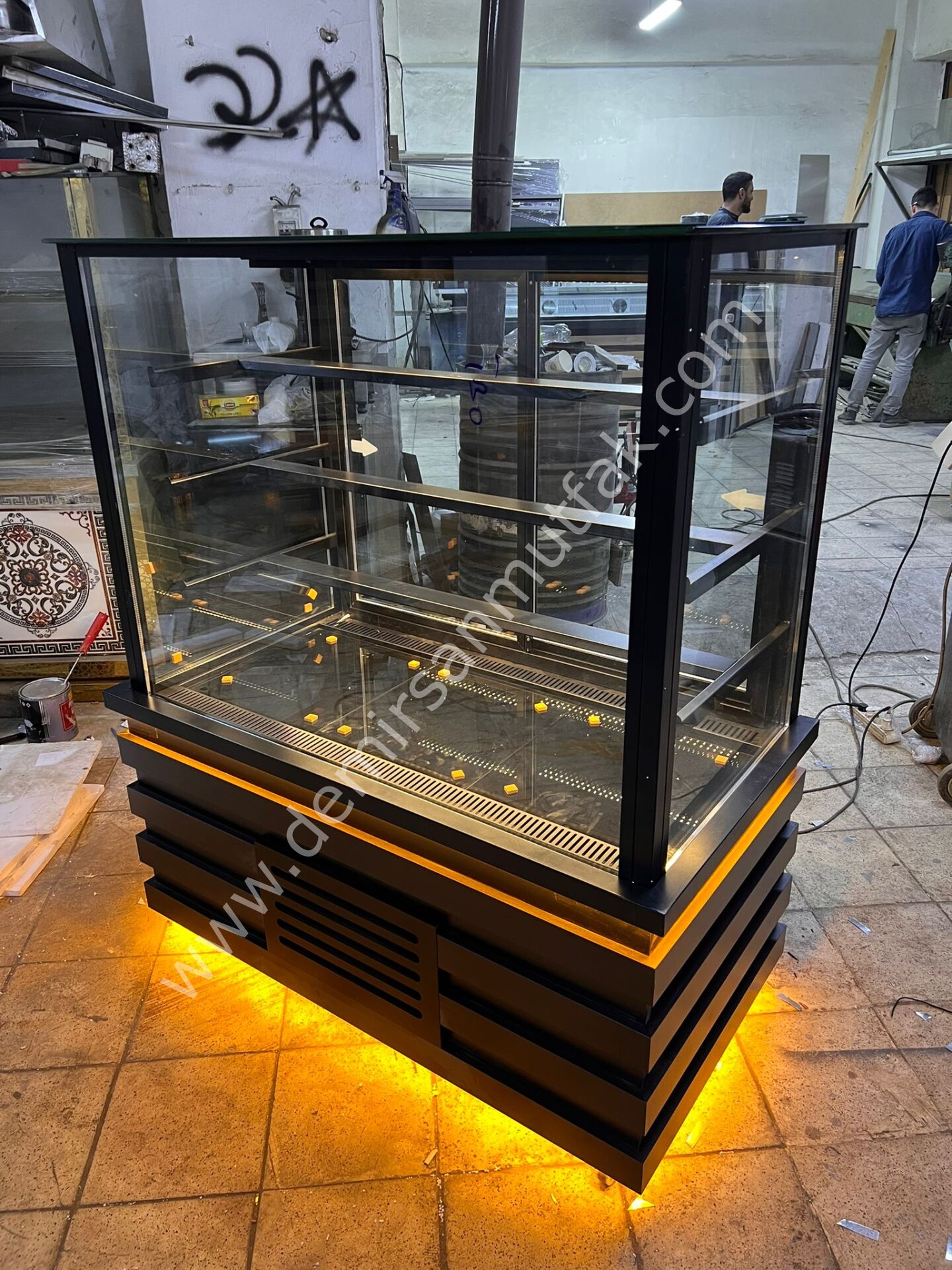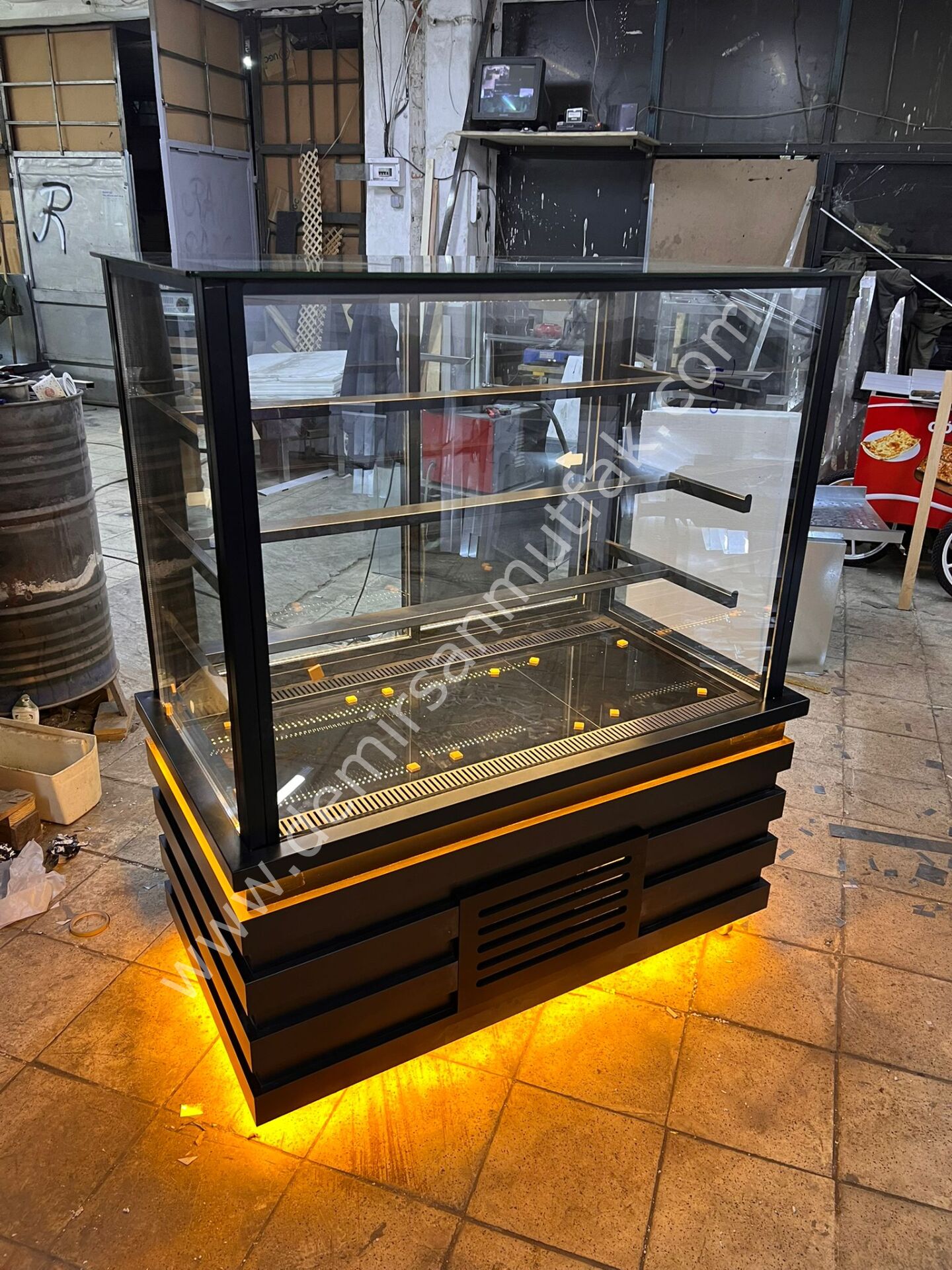 Güçlü tasarım dili ve profesyonel teşhir performansı ile dikkat çeken bu siyah modern pasta teşhir dolabı, ürünlerinizi hem estetik hem de satış odaklı bir sunumla müşterilerinizle buluşturur. Mat siyah gövde tasarımı, alt bölümde kullanılan sıcak LED zemin aydınlatması ile birleşerek işletmenize premium ve dikkat çekici bir atmosfer kazandırır. Koyu tonlu vitrinler, ürün renklerini daha fazla ön plana çıkararak görsel kontrast oluşturur ve müşteri ilgisini doğrudan sergilenen ürünlere yönlendirir.