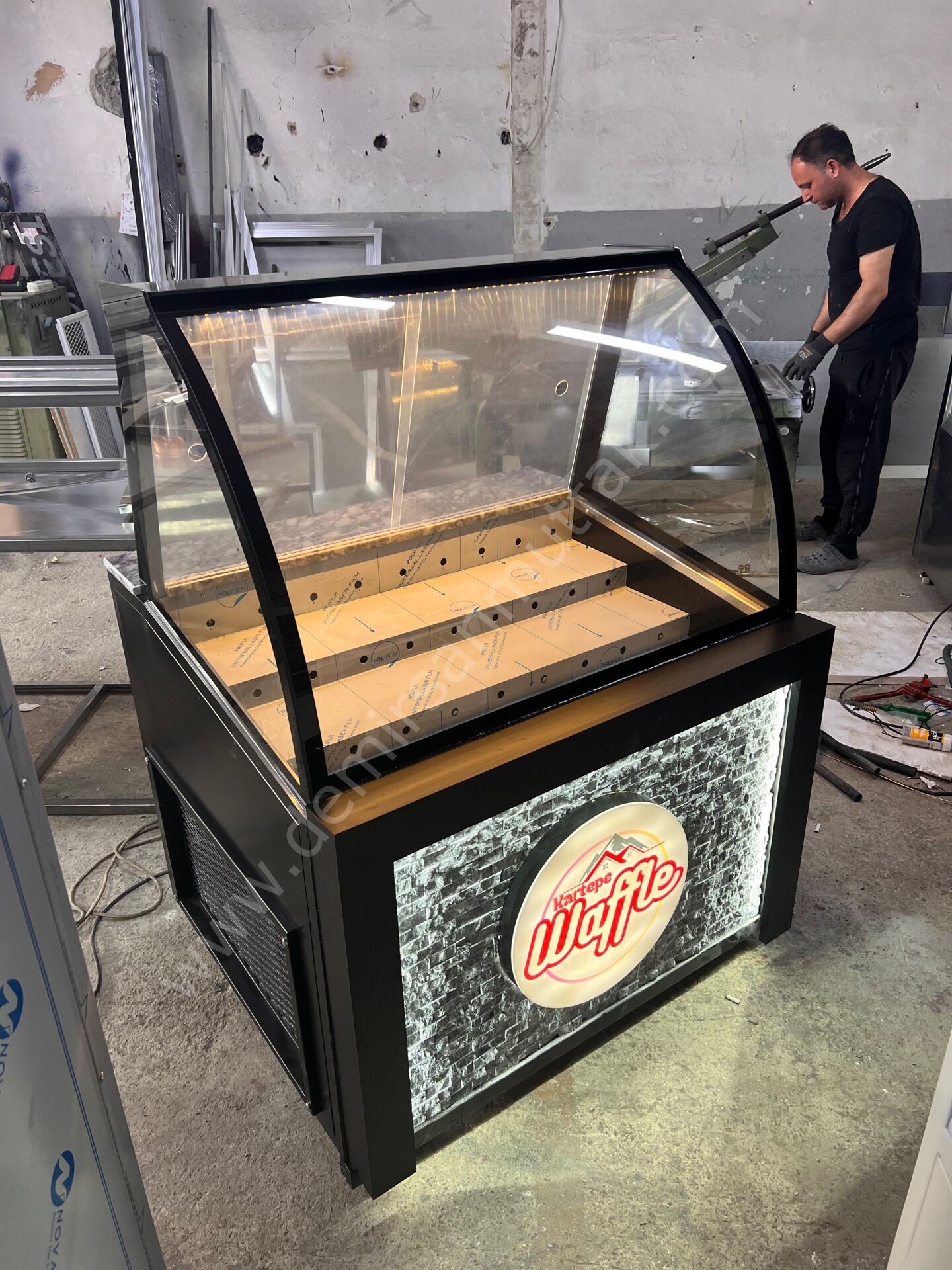 Ürünlerinizi vitrinde öne çıkararak müşteri ilgisini ilk bakışta yakalamak isteyen işletmeler için geliştirilen Dikkat Çekici Tasarımlı Waffle Teşhir Dolabı, estetik görünümü ve fonksiyonel yapısıyla güçlü bir sergileme alanı sunar. Geniş cam korumalı teşhir bölümü waffle, krep ve tatlı çeşitlerinin net şekilde görünmesini sağlayarak satın alma isteğini tetikleyen profesyonel bir sunum oluşturur. Görsel algıyı güçlendiren vitrin yapısı özellikle yoğun yaya trafiğine sahip noktalarda satış performansına doğrudan katkı sağlar.