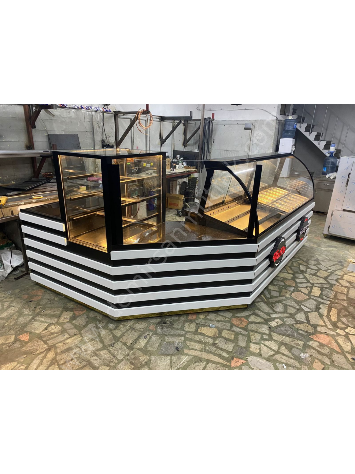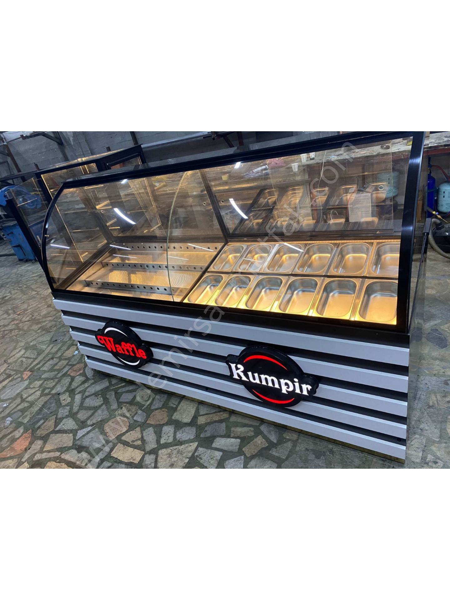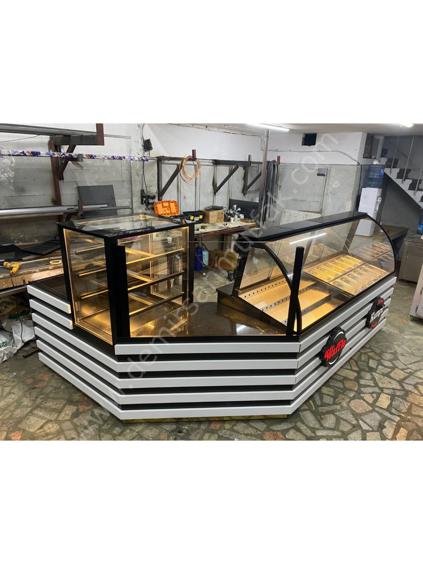 Farklı ürün gruplarını tek noktada sergilemek isteyen işletmeler için tasarlanan Waffle, Kumpir ve Pasta Tatlı Teşhir Dolabı; fonksiyonelliği ve güçlü görsel sunumu bir araya getirir. Ayrı bölmelerden oluşan yapısı sayesinde waffle malzemeleri, kumpir içerikleri ve tatlı çeşitleri düzenli şekilde konumlandırılabilir.