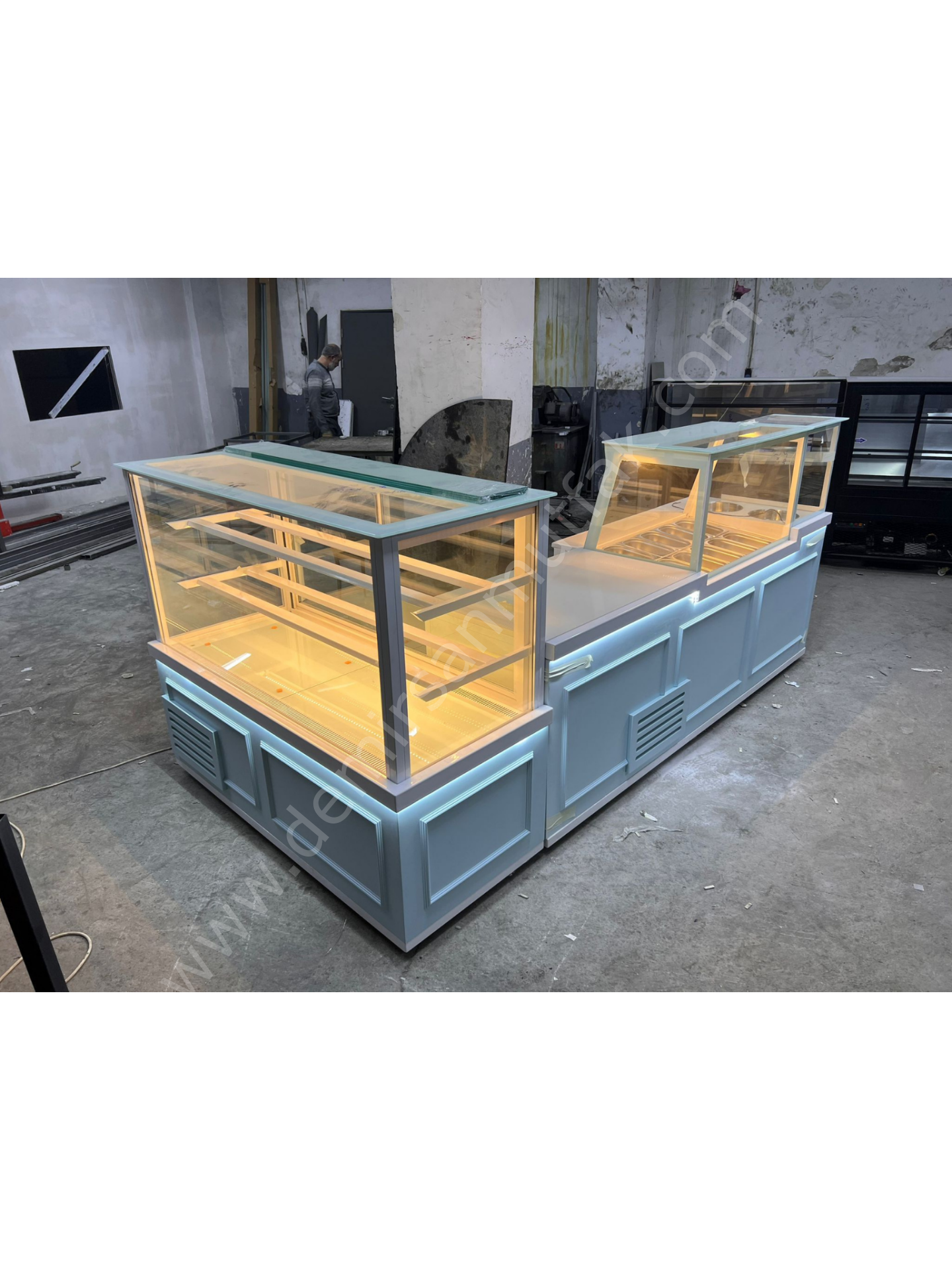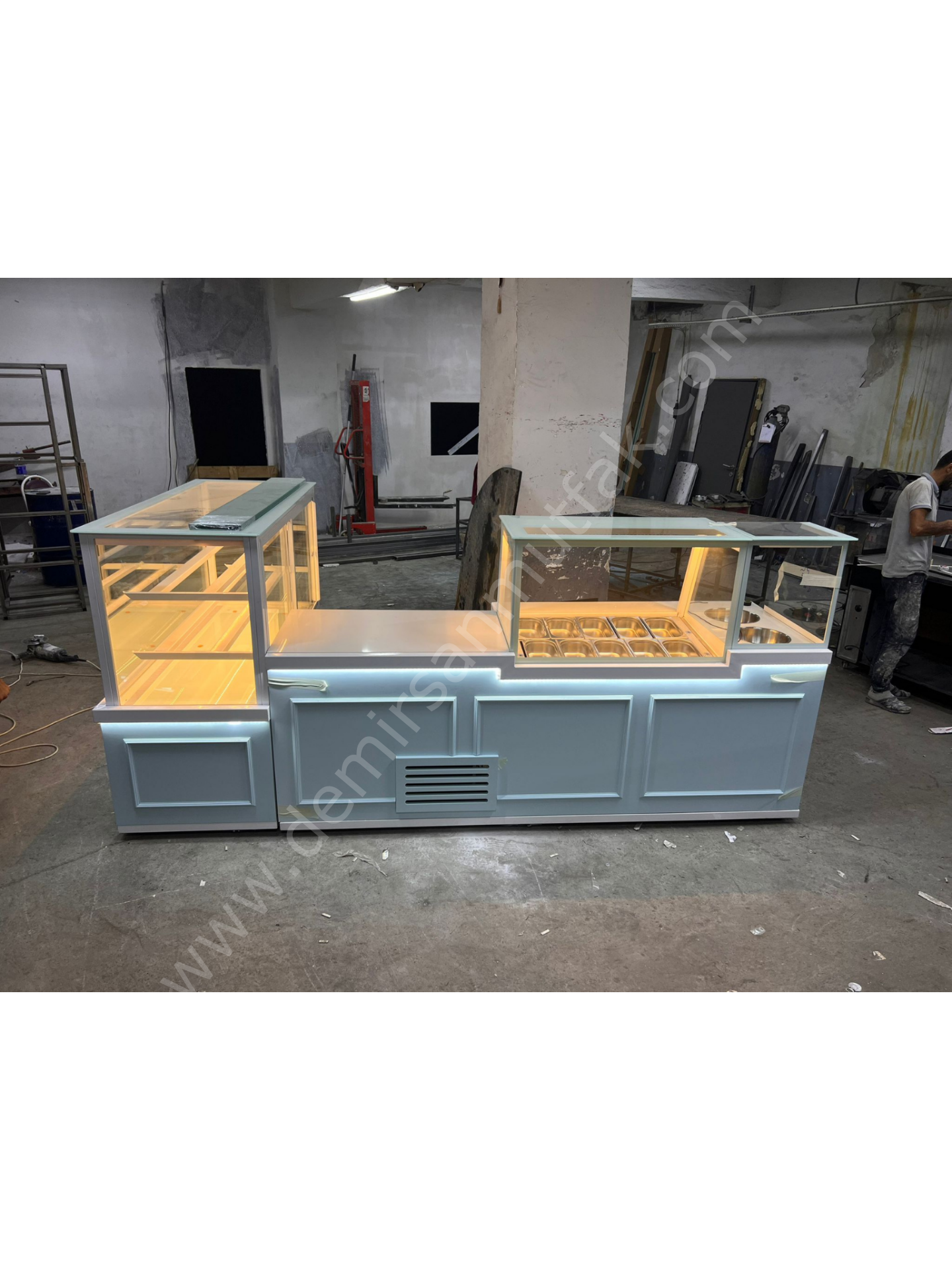 Cam panellerle çevrili geniş sergileme alanı, ürünlerin dış etkenlerden korunmasına katkı sağlarken hijyen algısını da yükseltir. Ergonomik tezgah yapısı personelin rahat hareket etmesine imkan tanıyarak yoğun saatlerde iş akışının daha kontrollü ilerlemesini destekler. Tek gövdede çoklu kullanım sunması, ekipman kalabalığını azaltarak satış alanının daha düzenli ve ferah görünmesine yardımcı olur.